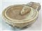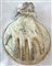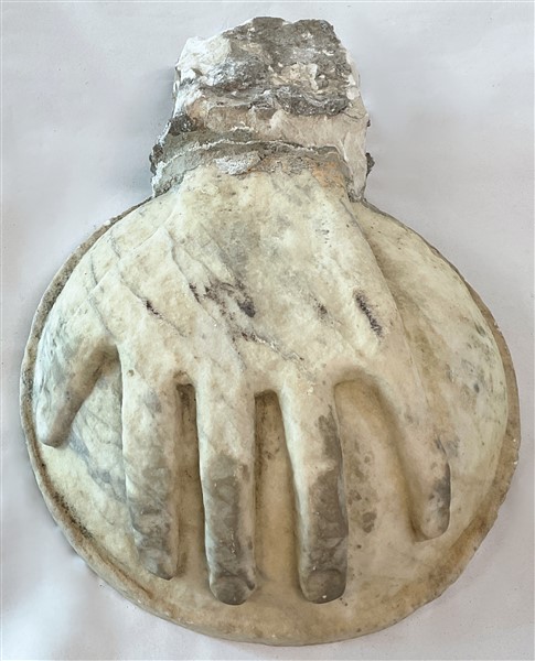 Antica acquasantiera in marmo scolpito con vasca circolare retta da mano e volto a rilievo all'interno (cm 35x26) (difetti)