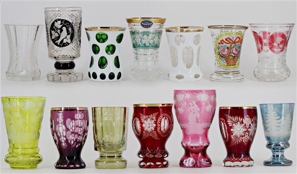 Manifattura diverse, secolo XIX-XX. Lotto composto da quattordici differenti bicchieri in vetro in parte policromo inciso a motivi floreali, figure e paesaggi. (h max cm 16,5) (difetti)