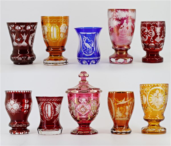 Manifattura di Boemia, secolo XIX-XX. Lotto composto da nove bicchieri e una coppa con coperchio in vetro policromo inciso a motivi floreali e figure. (h max cm 20) (difetti)