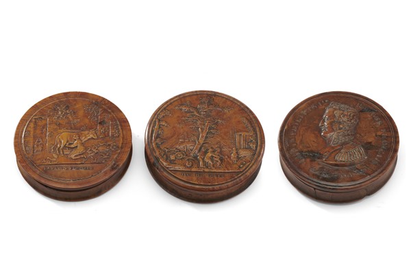 Arte del secolo XIX. Lotto composto da tre tabacchiere in acero pressato con coperchi decorati a rilievo e raffiguranti: Jeu de boule; La petite fermière; profilo di Louis Philippe I.re Roi des Français (1830). Interni in tartaruga (d. max cm 8,5) (difetti)