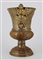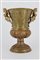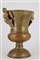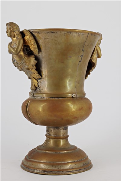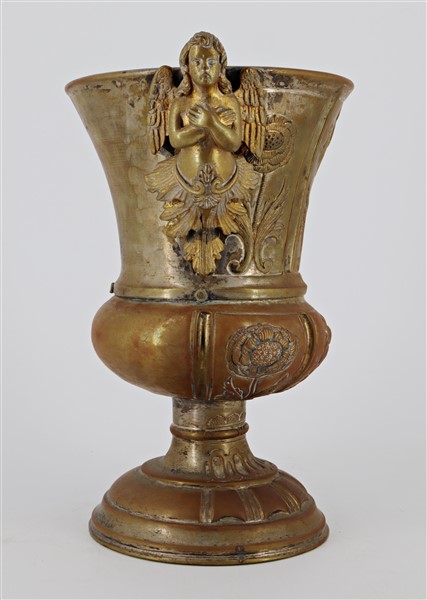Vaso biansato in rame dorato con corpo sbalzato a decoro floreale, anse a busto d'angelo. Secolo XIX (cm 20x27) (difetti)