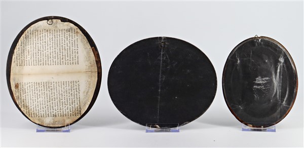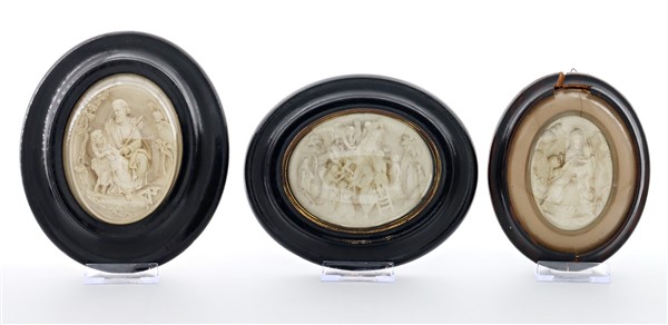 Arte del secolo XIX. Lotto composto da tre bassorilievi in schiuma di mare con soggetti religiosi (h max cm 12) in cornici ebanizzate (difetti, mancanze e rotture)