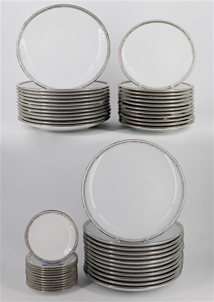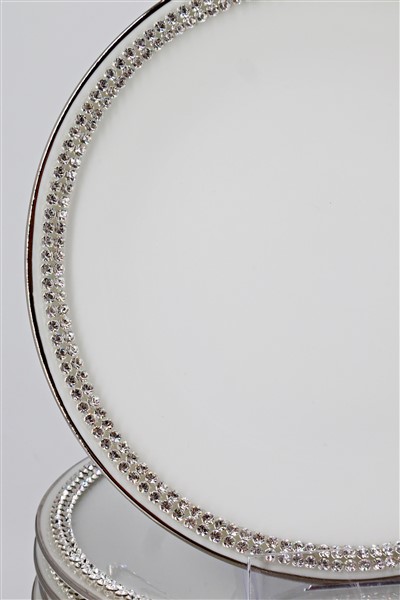 Manifattura di Limoges, Sophie Villepigue. Parte di servizio da tavola in porcellana bianca con bordura in Swarovsky composto da dodici piatti piani, dodici sottopiatti, dodici piatti da frutta, dodici piattini da pane. In un cartone (difetti)