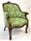 Poltrona a pozzetto in noce, braccioli terminanti a ricciolo, schienale sormontato da elemento decorativo intagliato. Rivestita in tessuto operato verde (difetti e restauri)