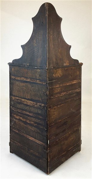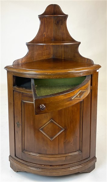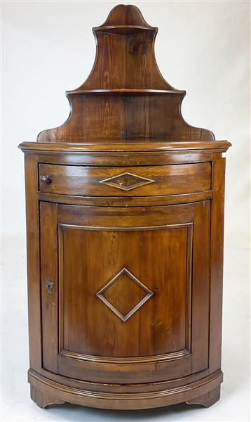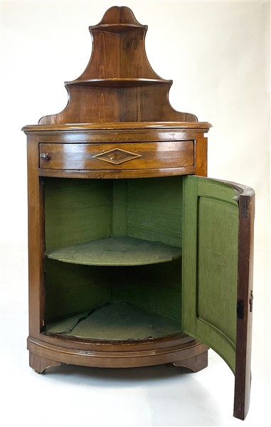 Angoliera con alzata sagomata a due ripiani in legni vari, fronte ad un'anta ed un cassetto. Secolo XIX (h cm 165) (difetti)