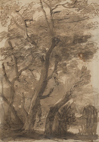 -Anonimo del secolo XVIII, "Studio di alberi", penna e inchiostro bruno acquerellato in bruno (mm 245x171)
