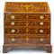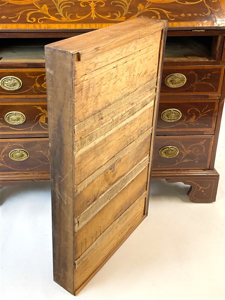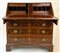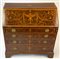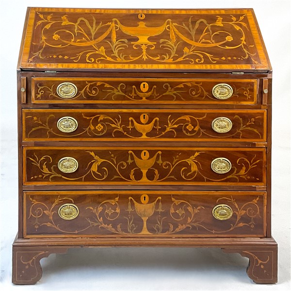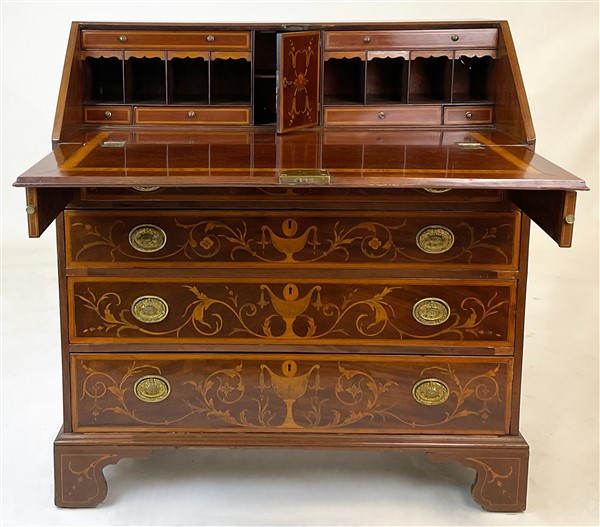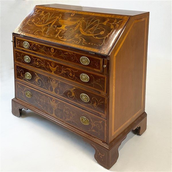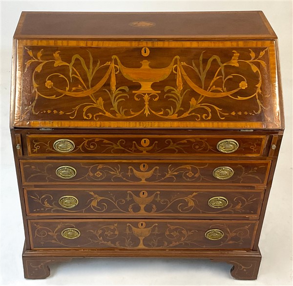 Ribalta impiallacciata in mogano, filettata e intarsiata in legni vari con fronte decorato a vasi e volute fogliate a tre cassetti più uno a mezza altezza sottopiano. Calatoia celante quattro tiretti, sportello e vani porta lettere. Piedi a mensola. Inghilterra, fine secolo XIX (cm 102,5x106x52) (difetti)