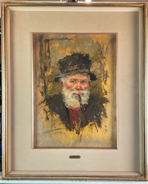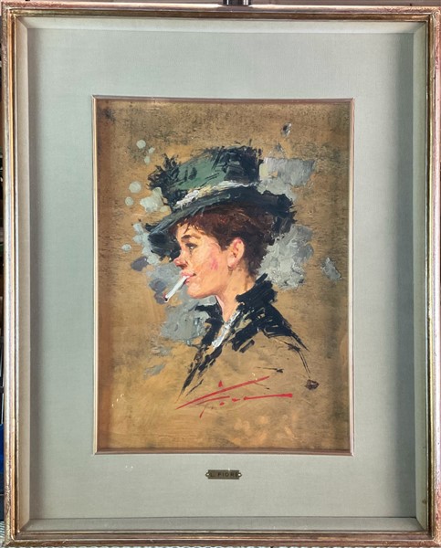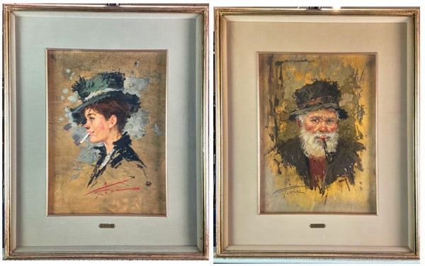 Ignoto del secolo XX, Coppia di dipinti ad olio su compensato raffiguranti una donna con sigaretta e un uomo con pipa (cm 40x28)