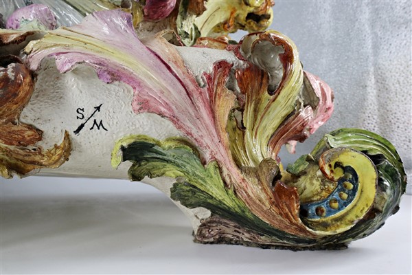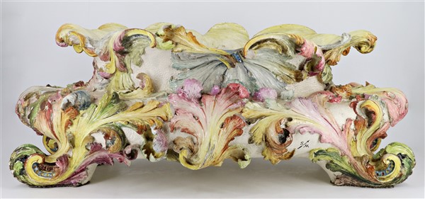 Fioriera in ceramica decorata in policromia a volute fogliate, secolo XX. (cm 70x28x38) marca S M alternate da freccia (difetti)