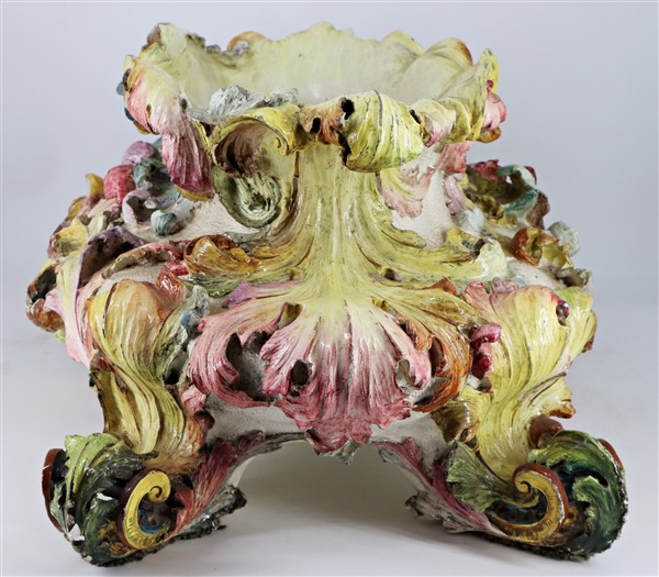 Fioriera in ceramica decorata in policromia a volute fogliate, secolo XX. (cm 7
