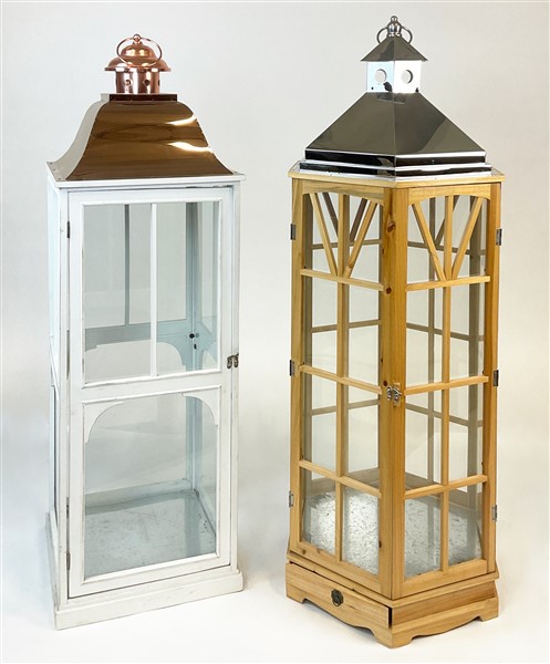 Lotto composto da due grandi lanterne in legno e metallo (h. max cm 125) (difetti)