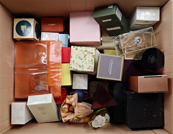 Lotto composto da numerose scatole di eau de toilette, eau de parfum e profumatori d'ambiente quasi tutti in confeziione originale, alcuni mai aperti (segni d'uso)