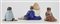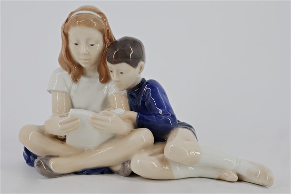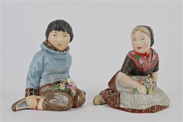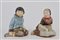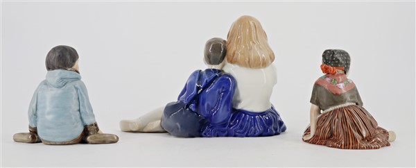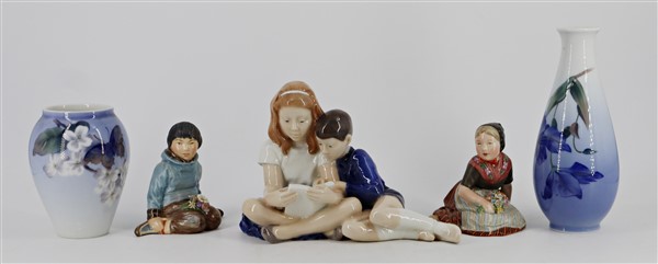 Manifattura Royal Copenhagen. Lotto composto da due vasetti ed un gruppo con fanciulli in porcellana policroma, uniti a due figurette di bambini in porcellana di diversa manifattura danese (h. max cm 19) (lievi difetti)