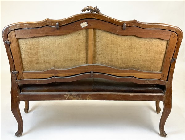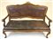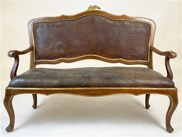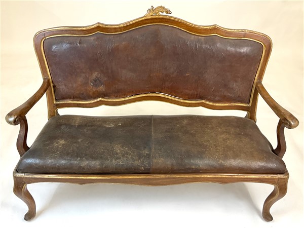 Divano a due posti in noce intagliato con bordure scanalate e dorate, seduta e schienale rivestiti in cuoio. Secolo XVIII (l cm 148) (difetti)