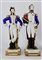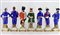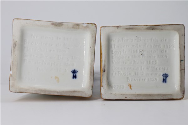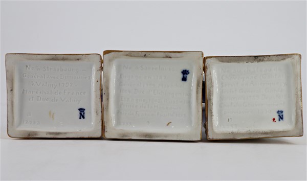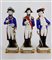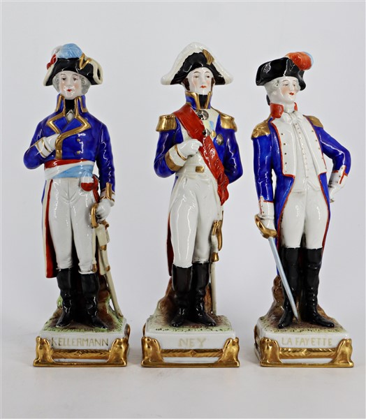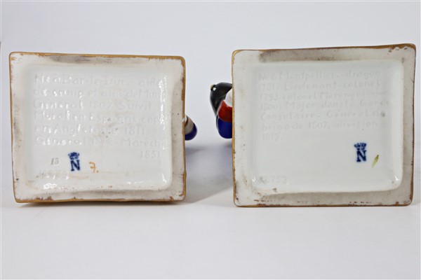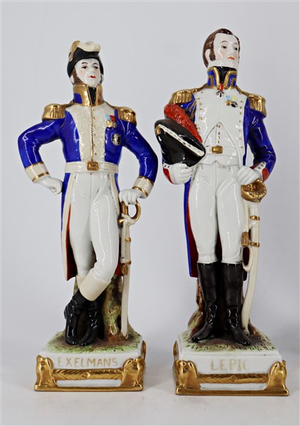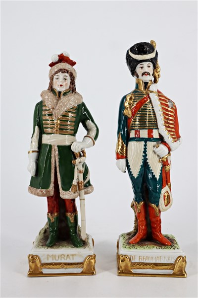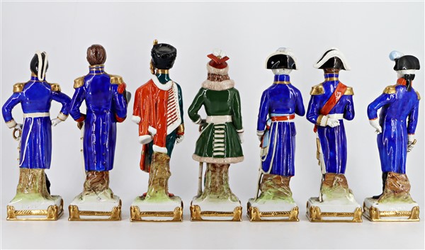 Manifattura del secolo XX. Gruppo di sette statuette in porcellana policroma raffiguranti personaggi della rivoluzione francese e napoleonici. Marca N coronata in blu e iscrizioni impresse nel fondo (h max cm 26) (difetti)