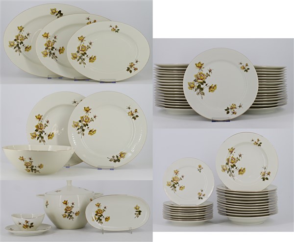 Manifattura Bavaria, Johann Haviland. Parte di servizio da tavola in porcellana decorato a motivo floreale, composto da trentaquattro piatti piani, dodici fondine, nove piatti da frutta, una zuppiera con coperchio, una salsiera, sei piatti da portata ed una insalatiera. In due cartoni (difetti)