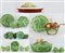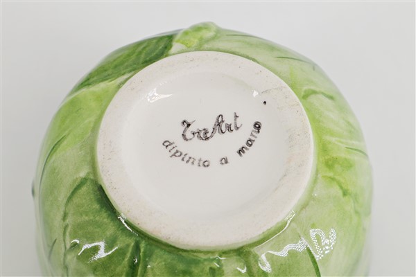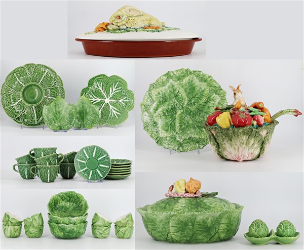 Manifatture diverse, secolo XX. Lotto composto da diversi oggetti da tavola in ceramica policroma decorata a motivo vegetale, tra cui due diverse zuppiere con coperchio di cui una con mestolo, sette tazze con piatto, due ciotole a foglia, due saliere con vassoietto, undici diverse ciotole, un vassoio, due diversi piatti da portata e un coperchio ovale con pirofila adattata. In due cartoni (difetti)