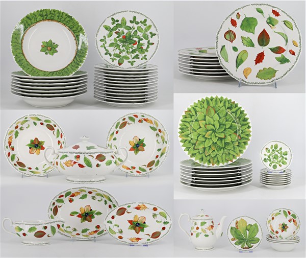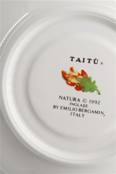 Manifattura Taitù by Emilio Bergamin, 1992. Parte di servizio da tavola in porcellana modello Natura composto da otto piatti piani, otto fondine, otto sottopiatti, tredici piatti da frutta, due insalatiere, due diversi piatti da portata, una zuppiera con coperchio, sette diversi piattini, una salsiera, una teiera, una lattiera, una zuccheriera, quattro ciotole e otto sotto tazza. In due cartoni (difetti)
