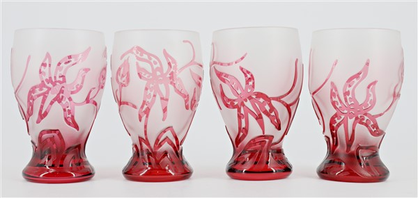 Manifattura J. Oertel. Otto bicchieri in vetro inciso ad acido nei toni del ros
