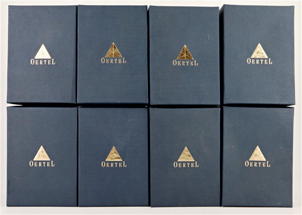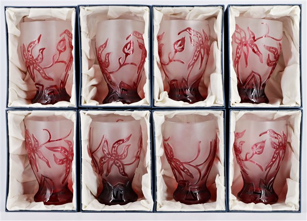 Manifattura J. Oertel. Otto bicchieri in vetro inciso ad acido nei toni del rosso a motivo stilizzato, in custodie (h cm 12 ca.) (difetti)
