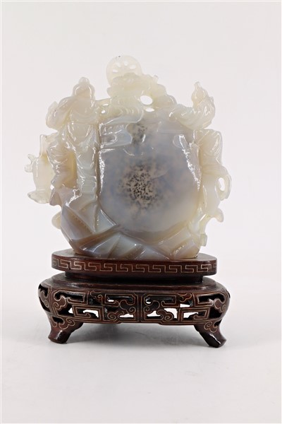 Gruppo scultoreo in agata poggiante su base in legno Cina, secolo XX (h cm 11)