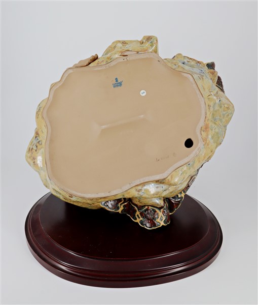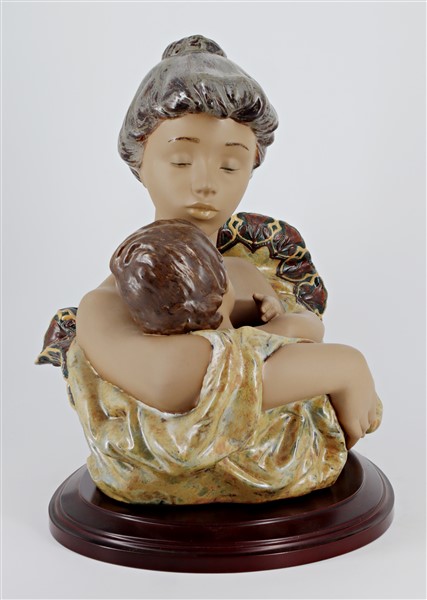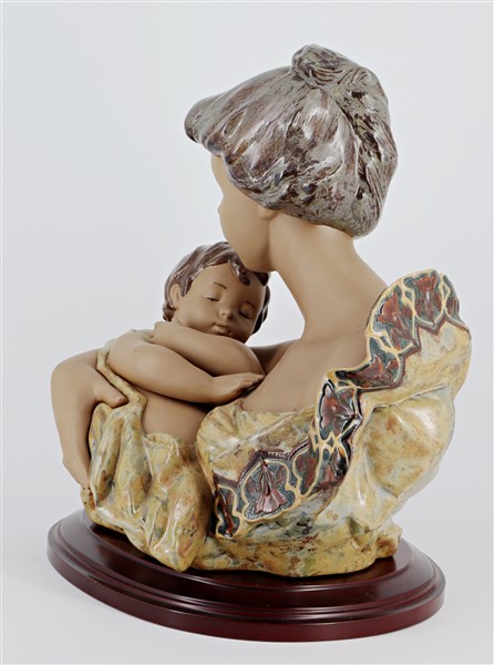Manifattura Lladrò. Gruppo in porcellana policroma raffigurante una maternità. Marcato sotto la base (cm 42x38) con base in legno (lievi difetti)