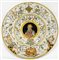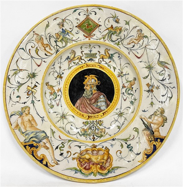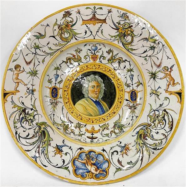 Manifattura del secolo XX. Coppia di grandi piatti da parete in maiolica policroma con ritratti nel cavetto e decoro a grottesche nella falda (d. cm 55) (difetti e un piatto con restauri)