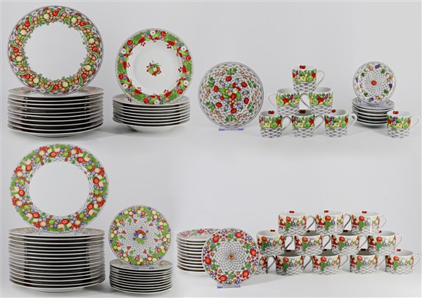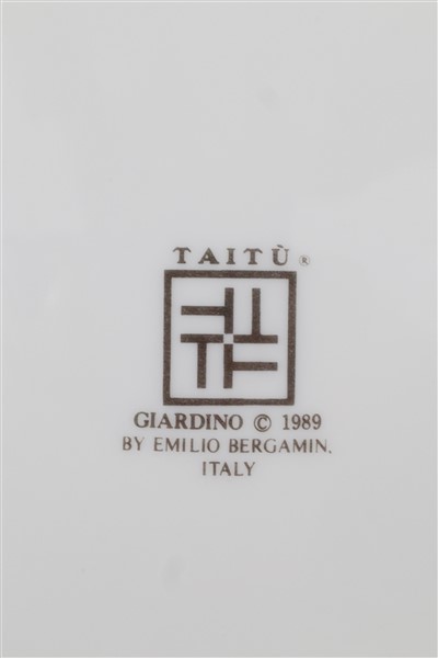 Manifattura Taitù by Emilio Bergamin. Parti di diversi servizi da tavola in porcellana decorata in policromia, tra cui sedici sottopiatti, undici piatti piani, nove fondine, undici piatti da dessert, dodici tazze da tè con piatto e sette tazze da caffè con piatto. In due cartoni (difetti)