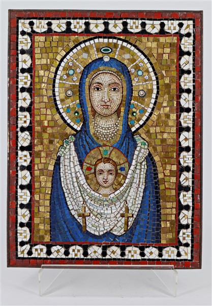Lot 1572 | Arte del secolo XX. Madonna con Bambino, mosaico policromo con cornice in metal