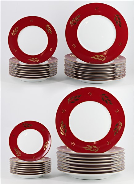 Manifattura di Limoges, Jean Louis Coquet. Parte di servizio da tavola in porcellana con bordura in rosso e decori in oro, composto da otto piatti piani, otto sottopiatti, otto piatti da dessert e otto piatti da frutta. In un cartone (difetti)