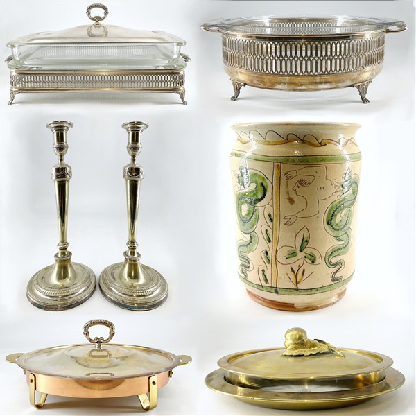 Lotto di diversi oggetti in metalli vari e metallo argentato ed un albarello in