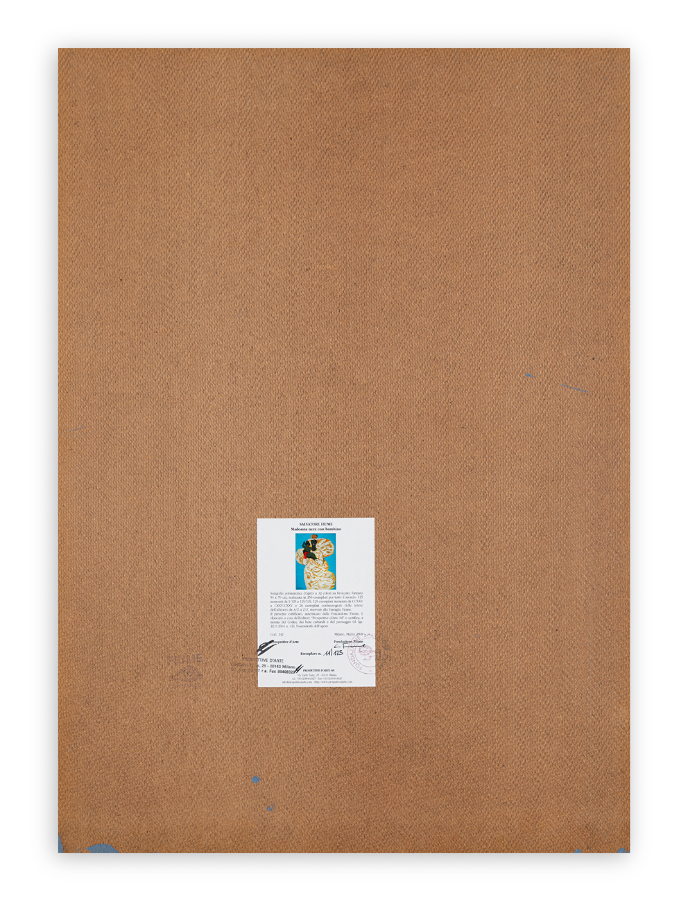 Certificato autenticità dalla Fondazione Fiume e rilasciato dall'Editore Prospettive d'Arte al retro con timbri della Fondazione Fiume e dell'Editore Prospettive d'Arte
