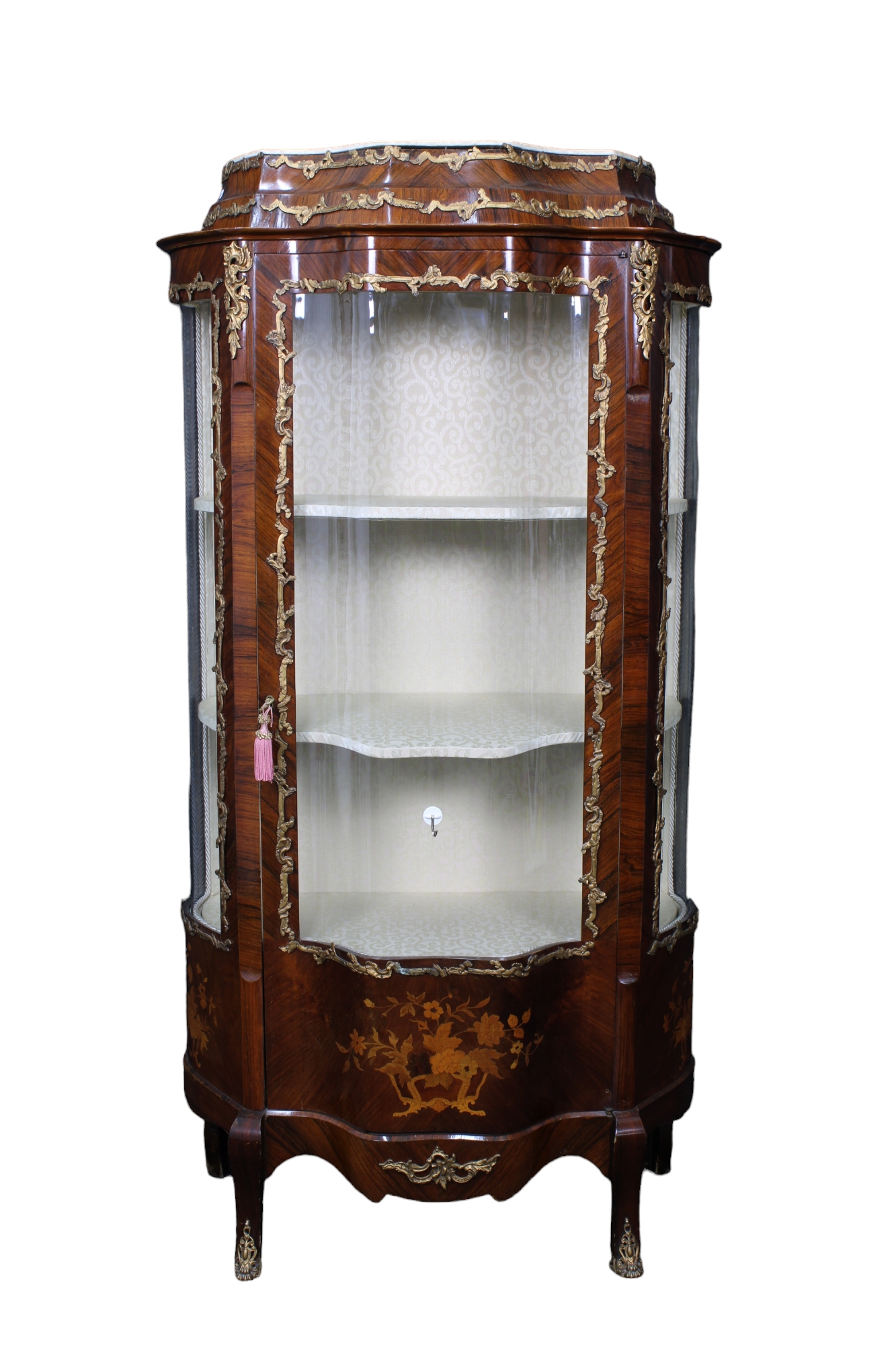 VETRINETTA STILE NAPOLEONE III in palissandro e intarsiata in diverse essenze, reca decorazioni in bronzo finemente cesellati Primi 900 h cm 168 x 80 x 50