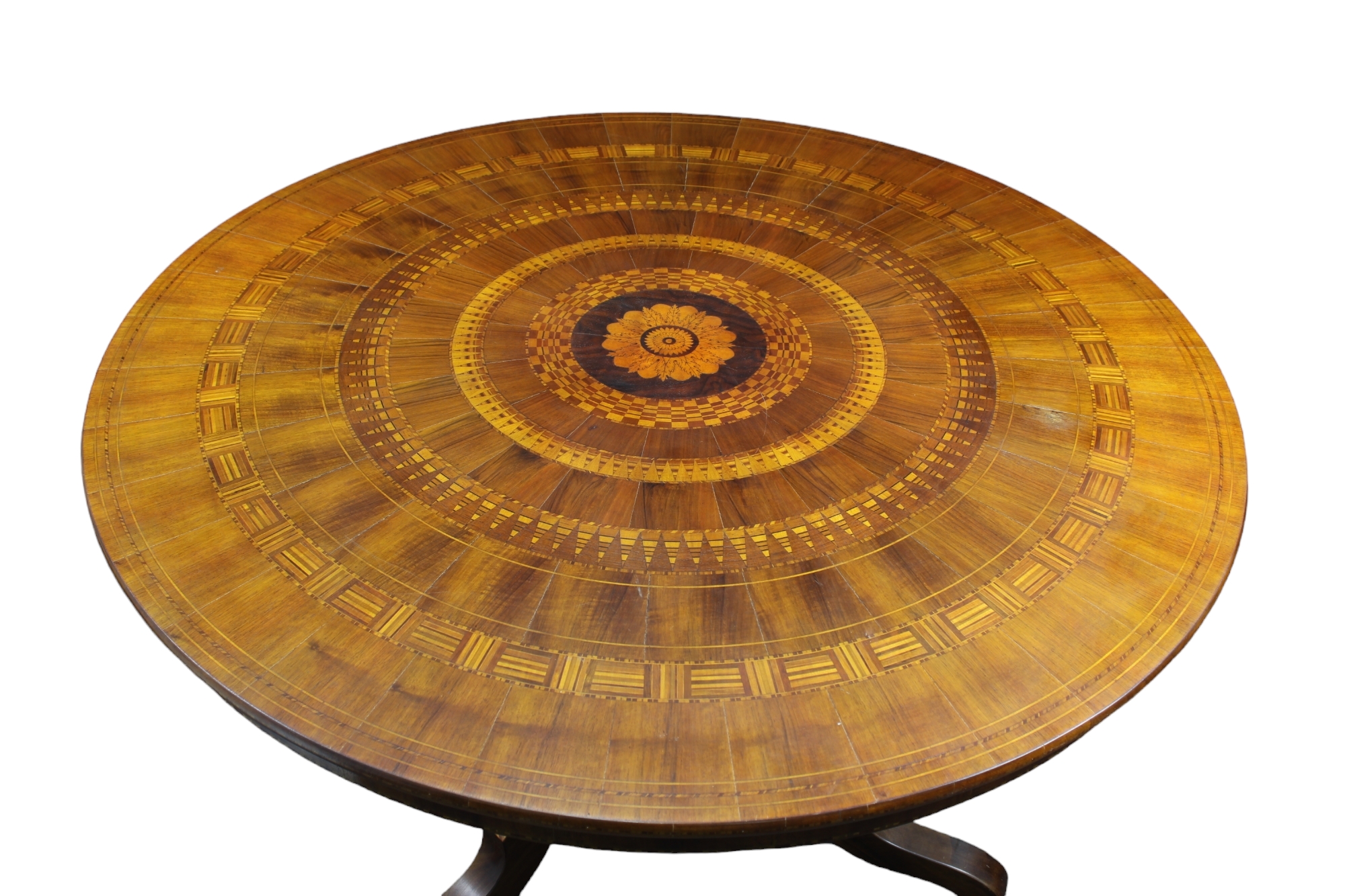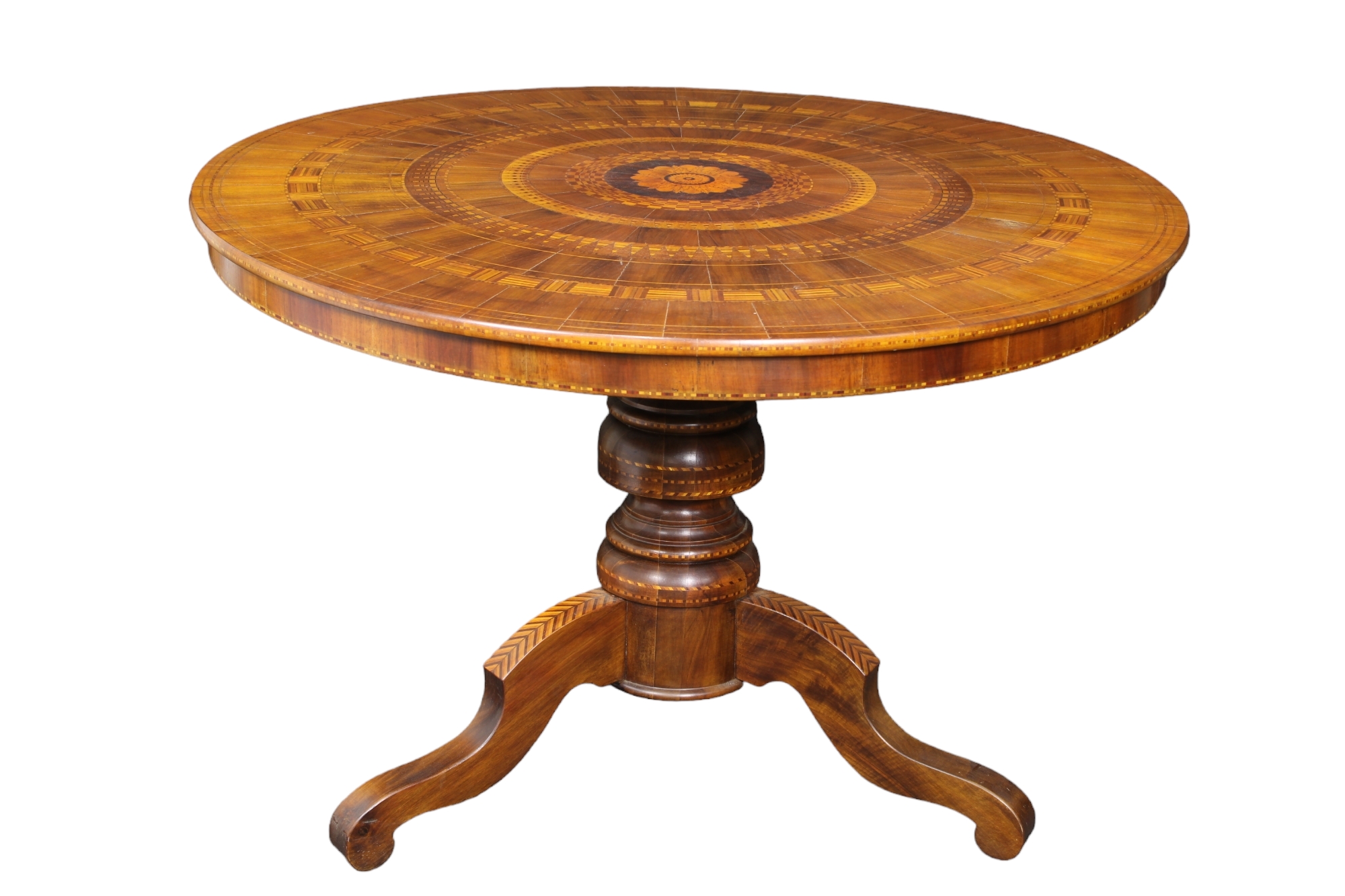 ELEGANTE TAVOLO DA CENTRO SORRENTINO lastronato in legno di noce intarsiato a motivi geometrici in varie essenze di legno Sorrento XIX secolo h cm 81 x 120