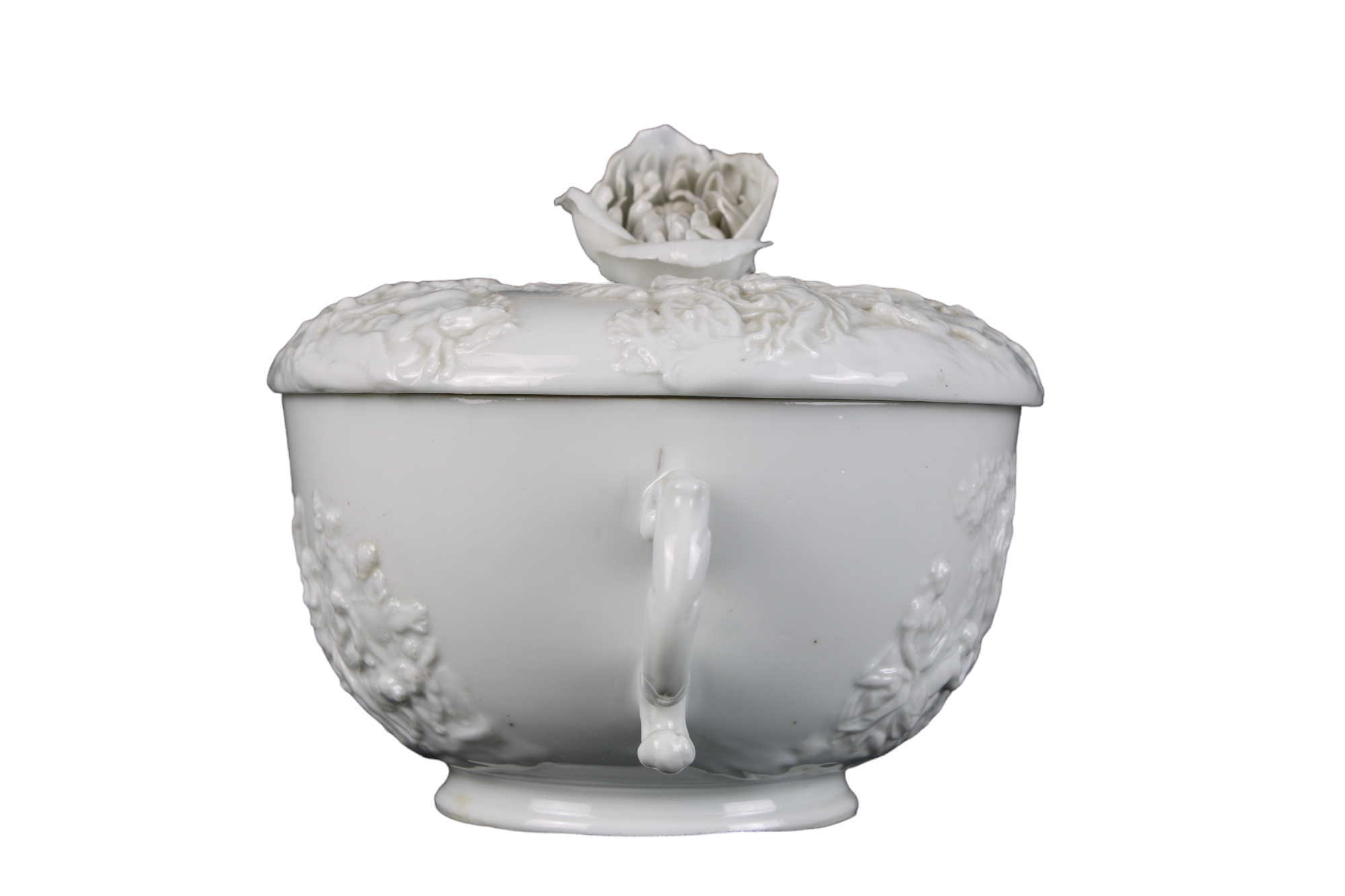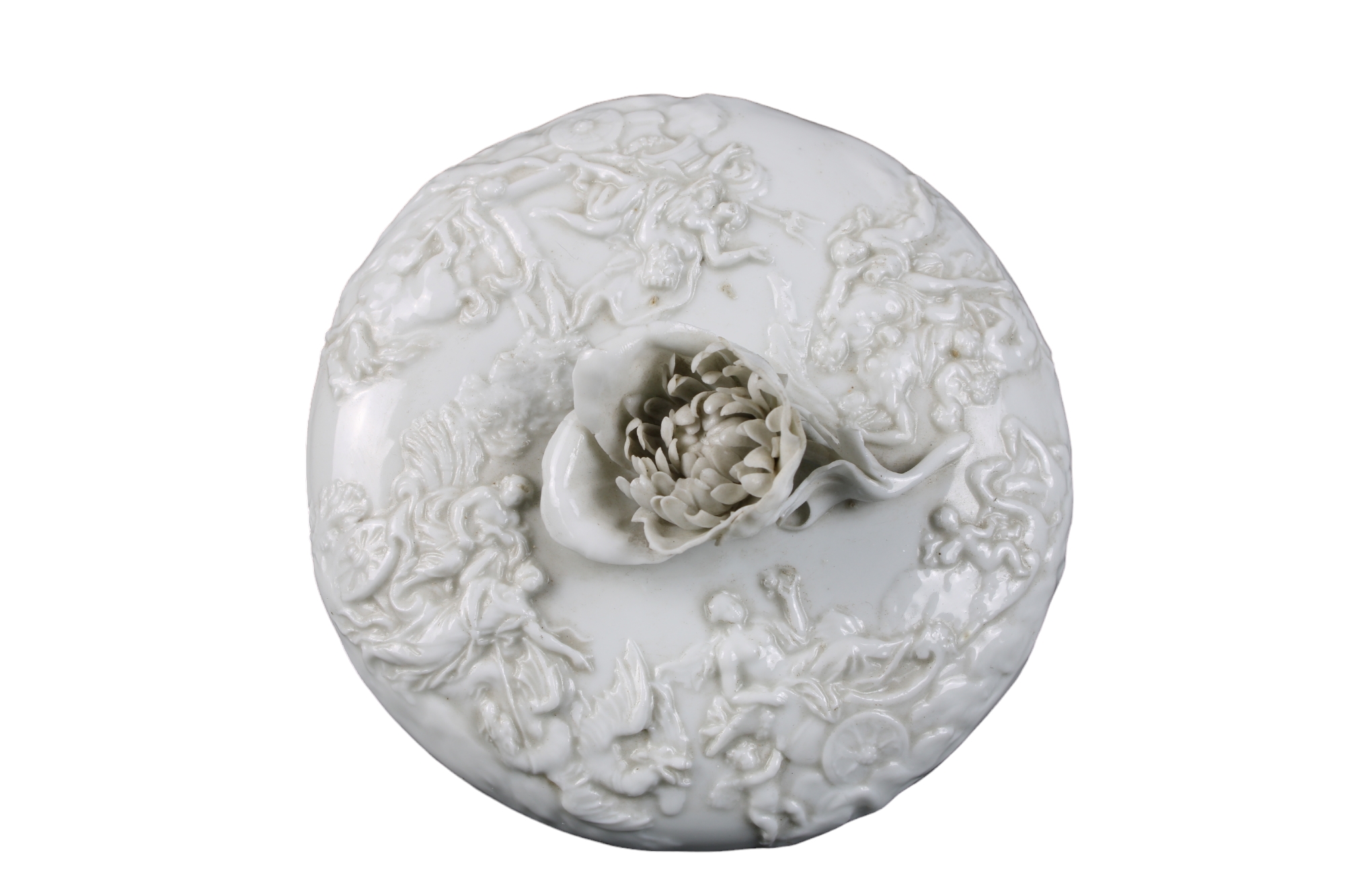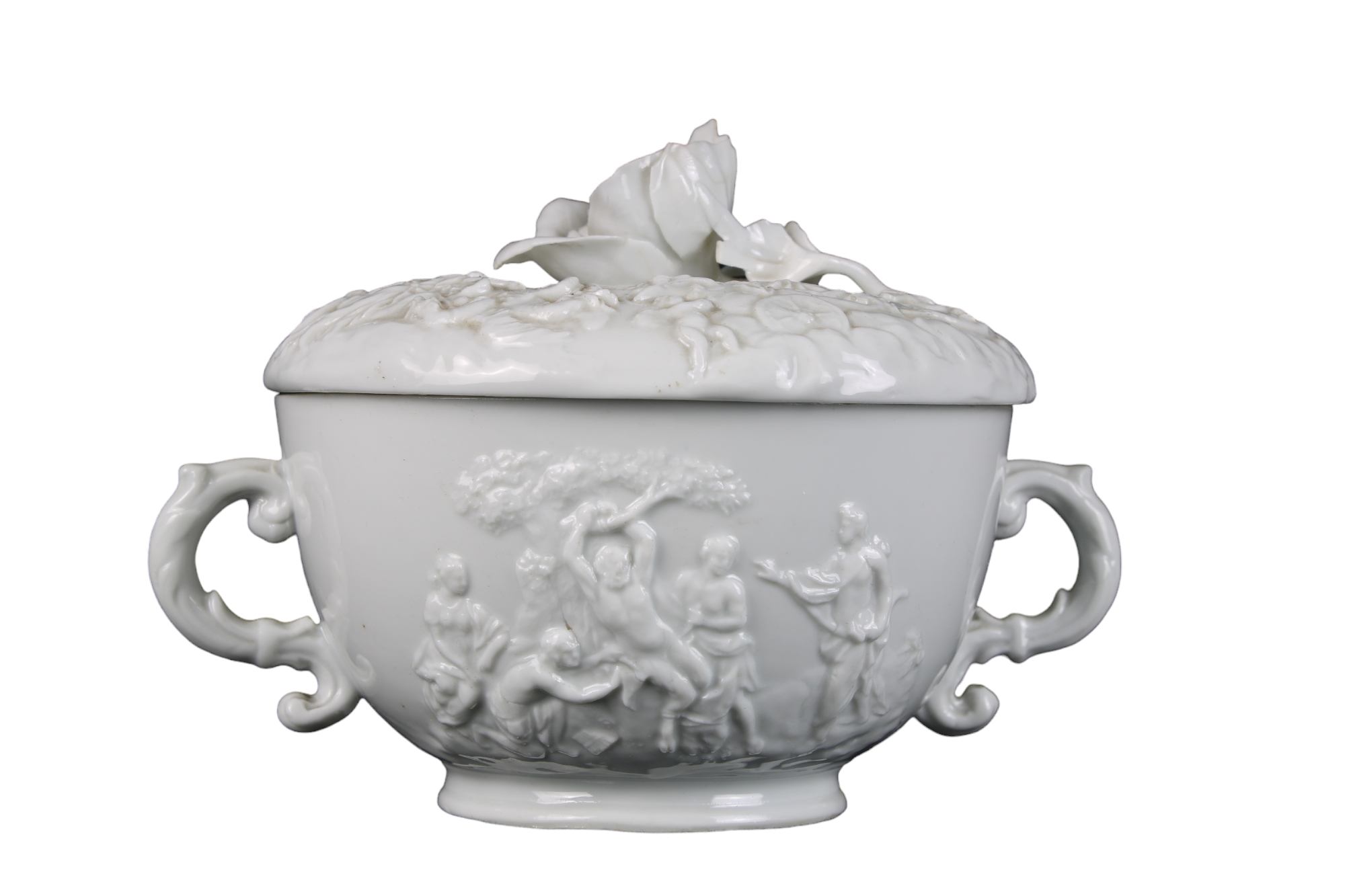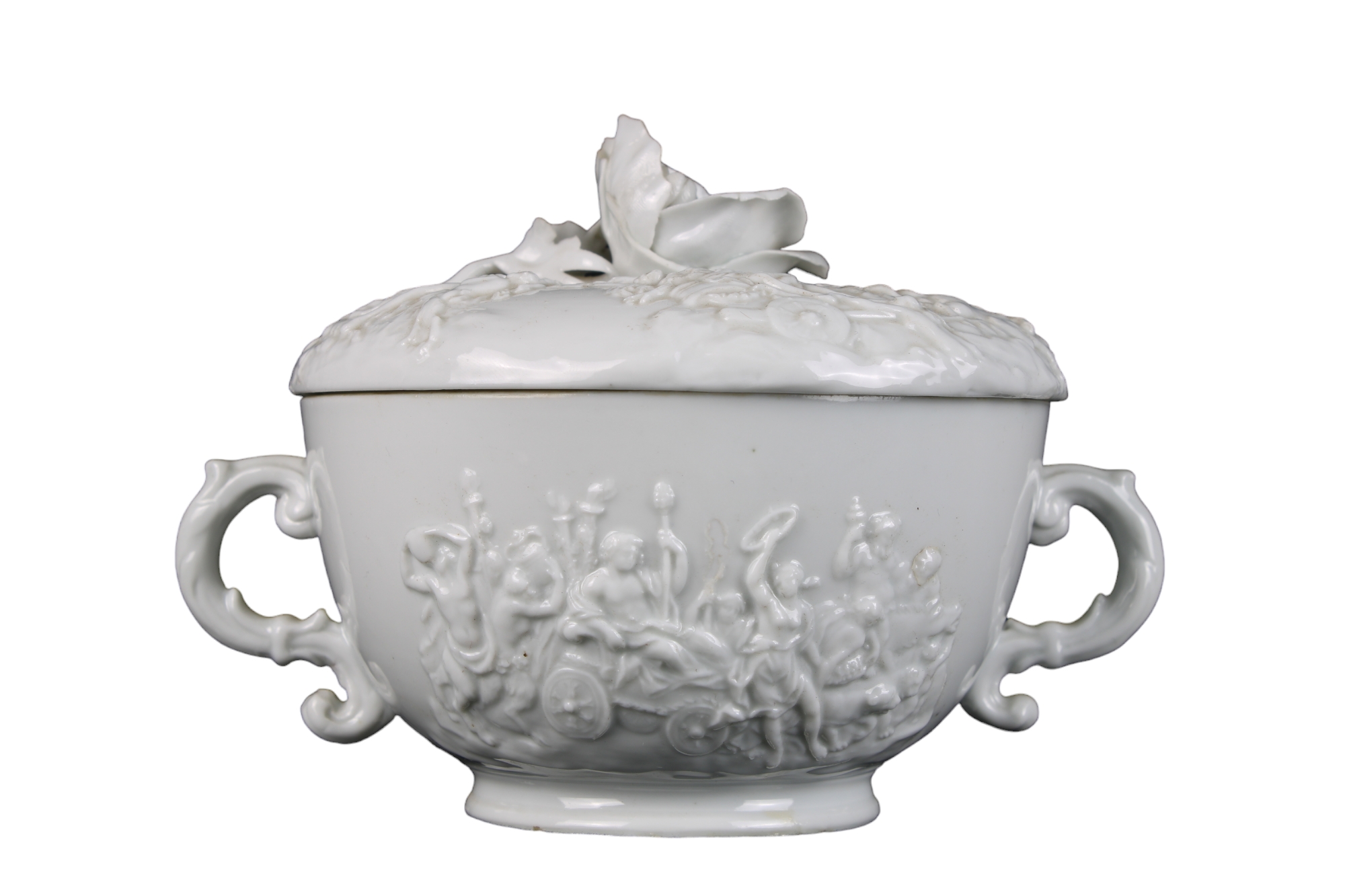 TAZZA DA PUERPERA in porcellana pasta tenera decorata a basso rilievo raffigurante scene mitologiche Italia Ginori XVIII secolo h cm 12 x 16