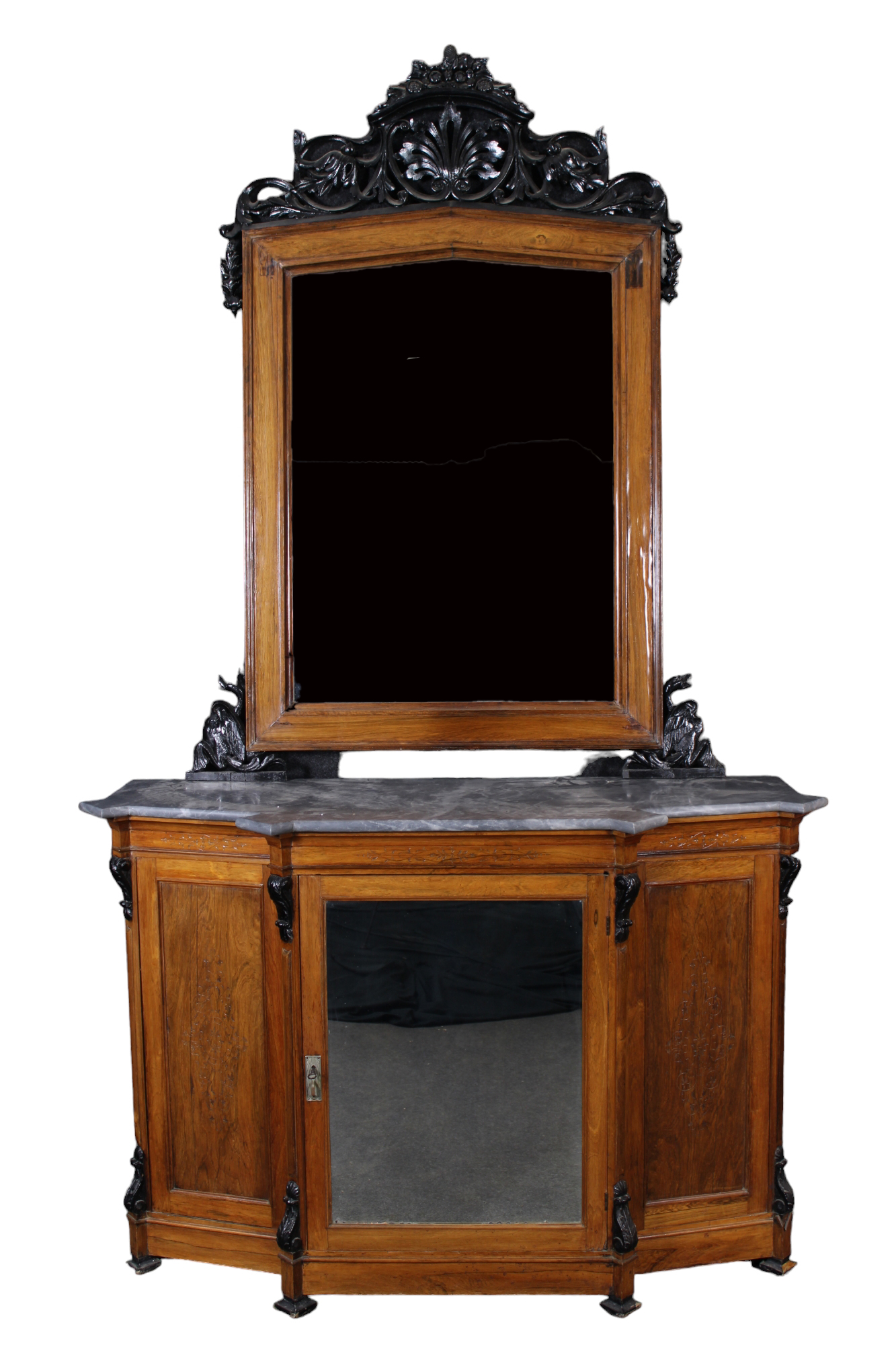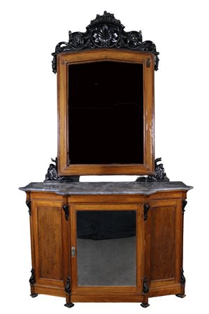 ETAGERE SCANTONATA CON SPECCHIERA in legno di noce e piano in marmo grigio Sicilia XIX secolo h cm 260 x 153 x 53