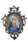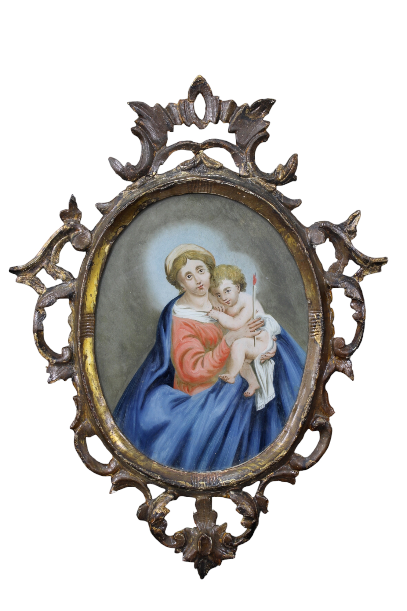 PITTURA SU VETRO DI FORMA OVALE Raffigurante Madonna con Bambino dentro bella cornice riccamente traforata, scolpita e dorata ad argento e mecca Sicilia XVIII secolo h cm 32 x 25/ cornice h cm 60 x 45
