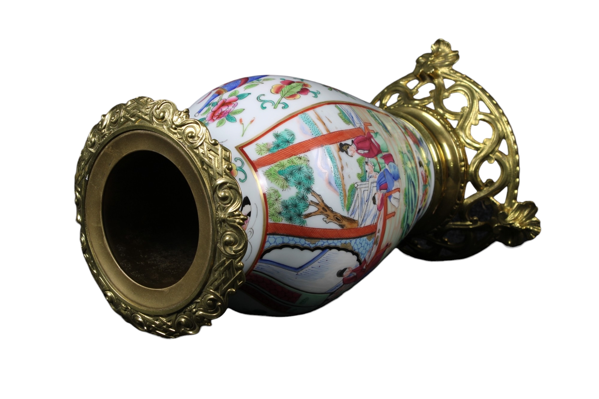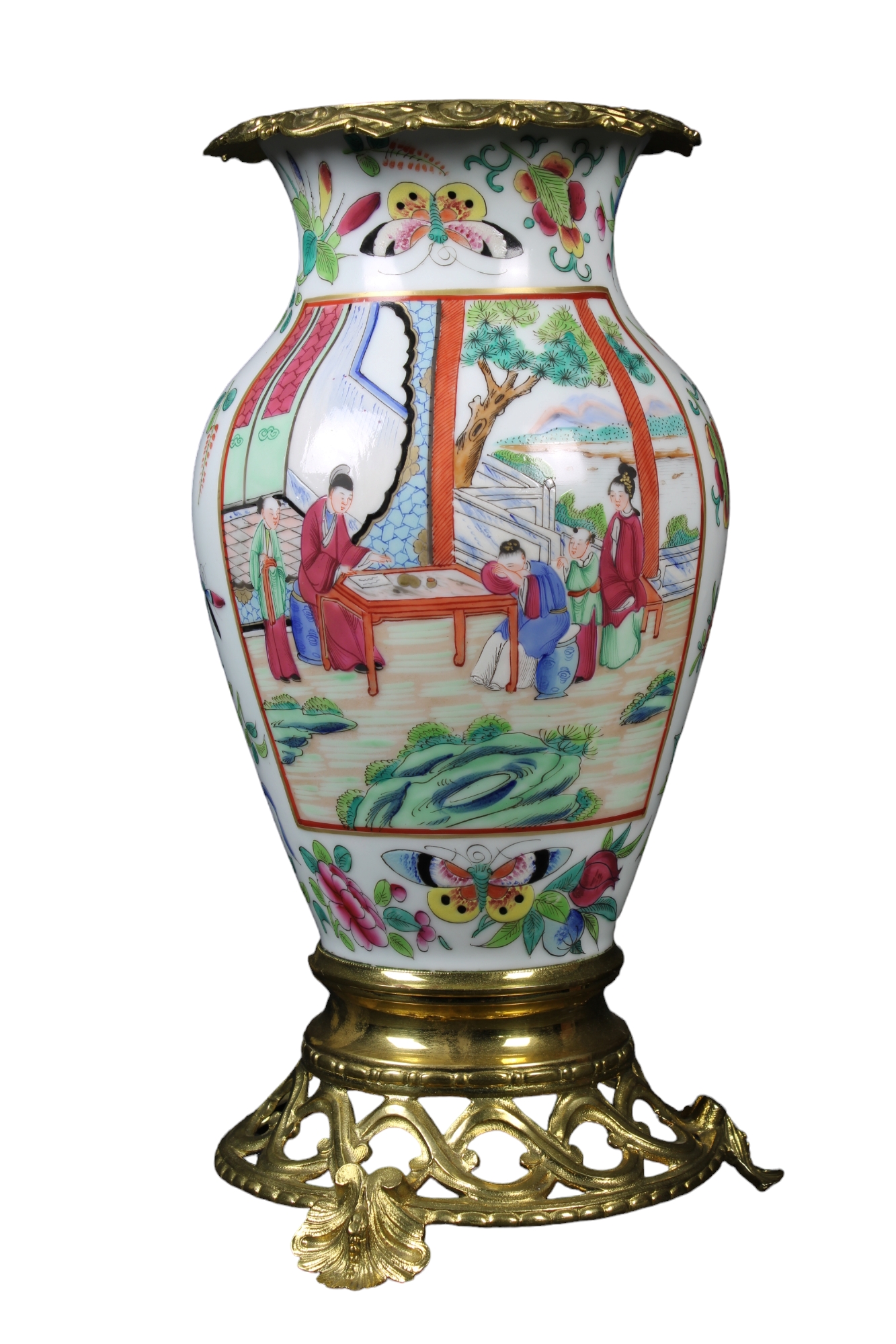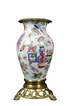 VASO in porcellana dipinto raffigurante chinoiserie montato in metallo dorato manifattura orientale XIX/XX secolo h cm 39 x 20