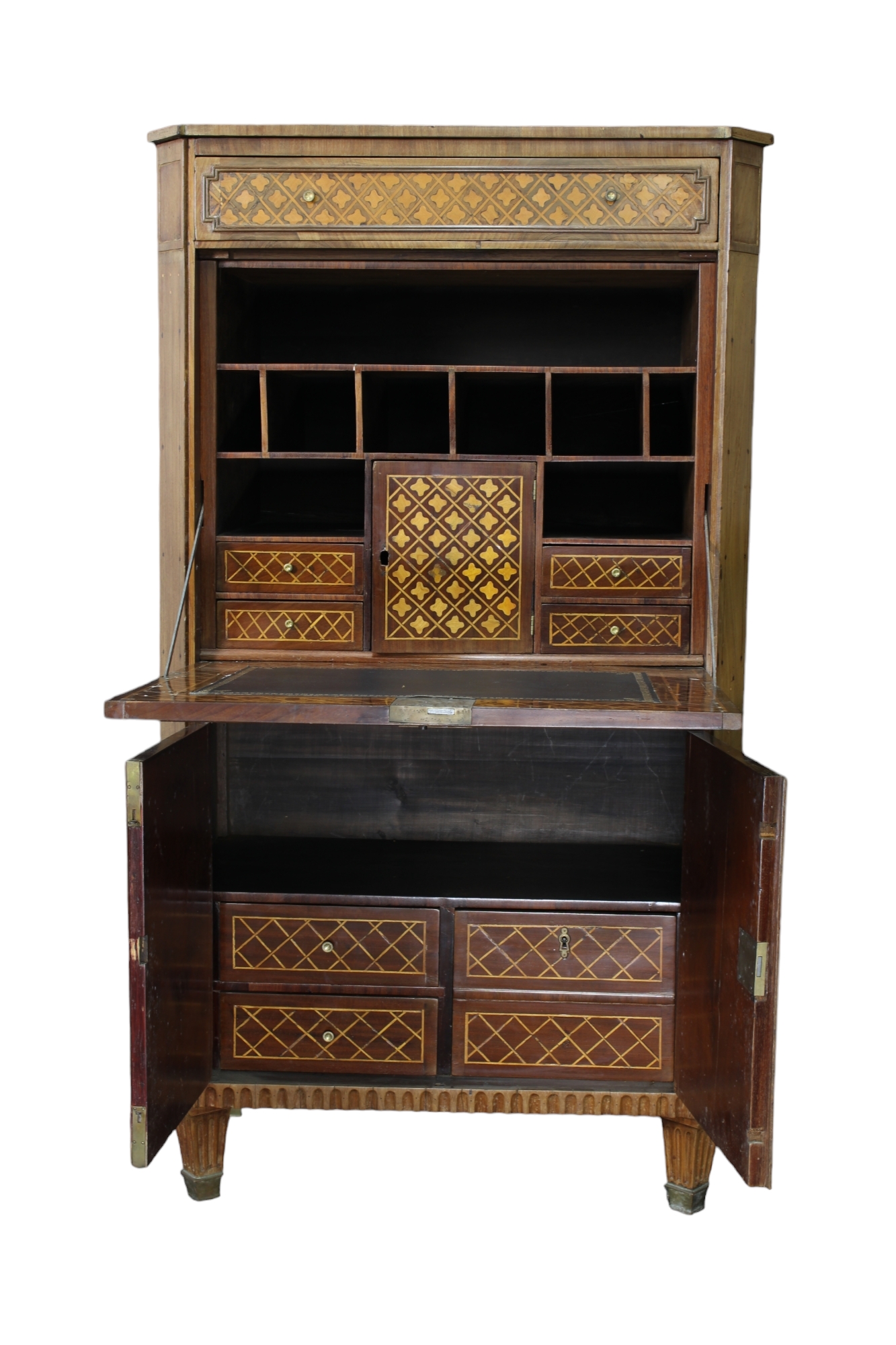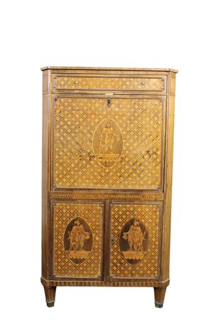 IMPORTANTE SECRETAIRE in mogano riccamente intarsiato raffigurante soldati dentro riserva Francia primi XIX secolo h cm 147 x 84 x 45