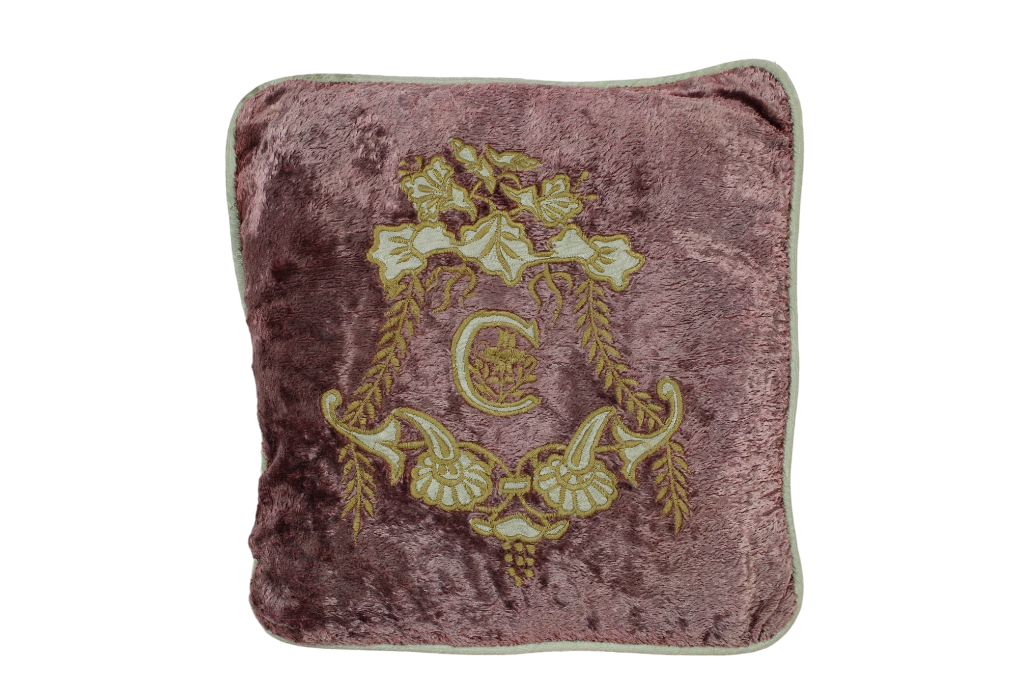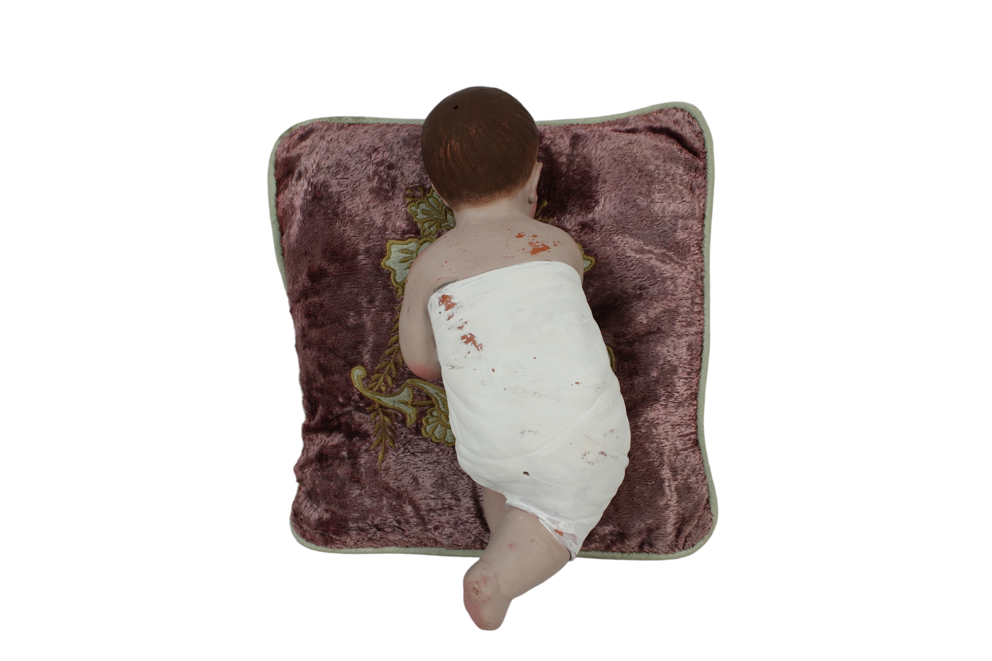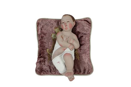 BAMBINELLO in terracotta dipinto appoggiato su cuscino in velluto maestranze siciliane primi 900 h cm 28 x 11 x 9