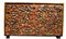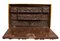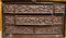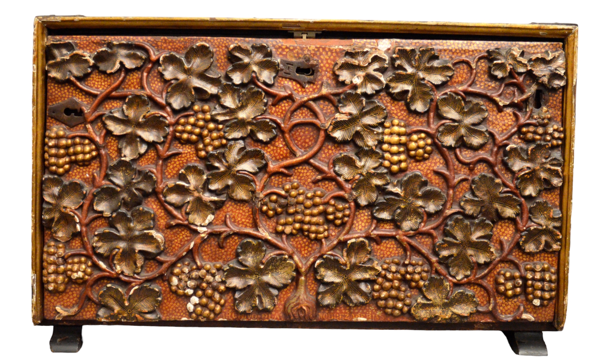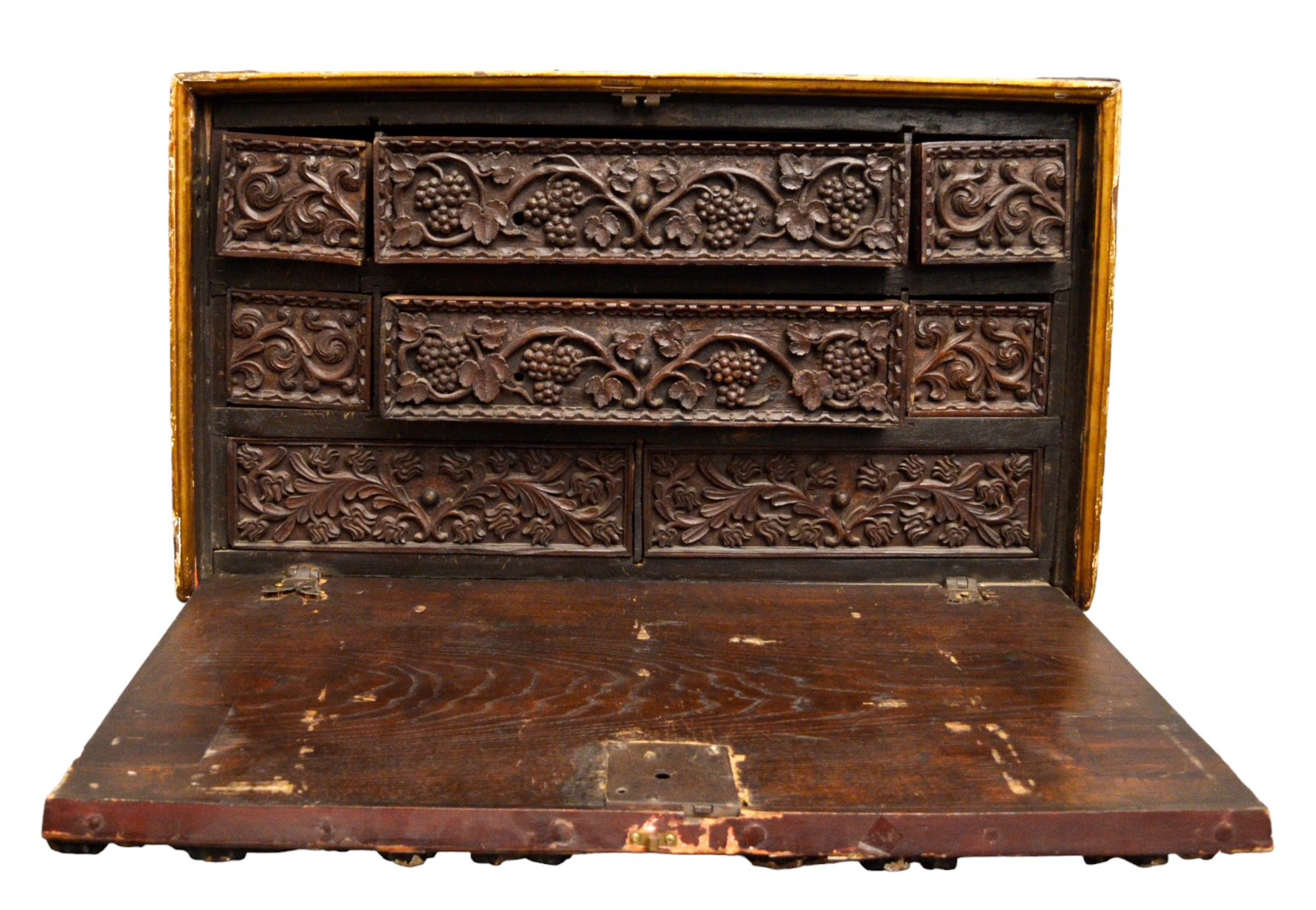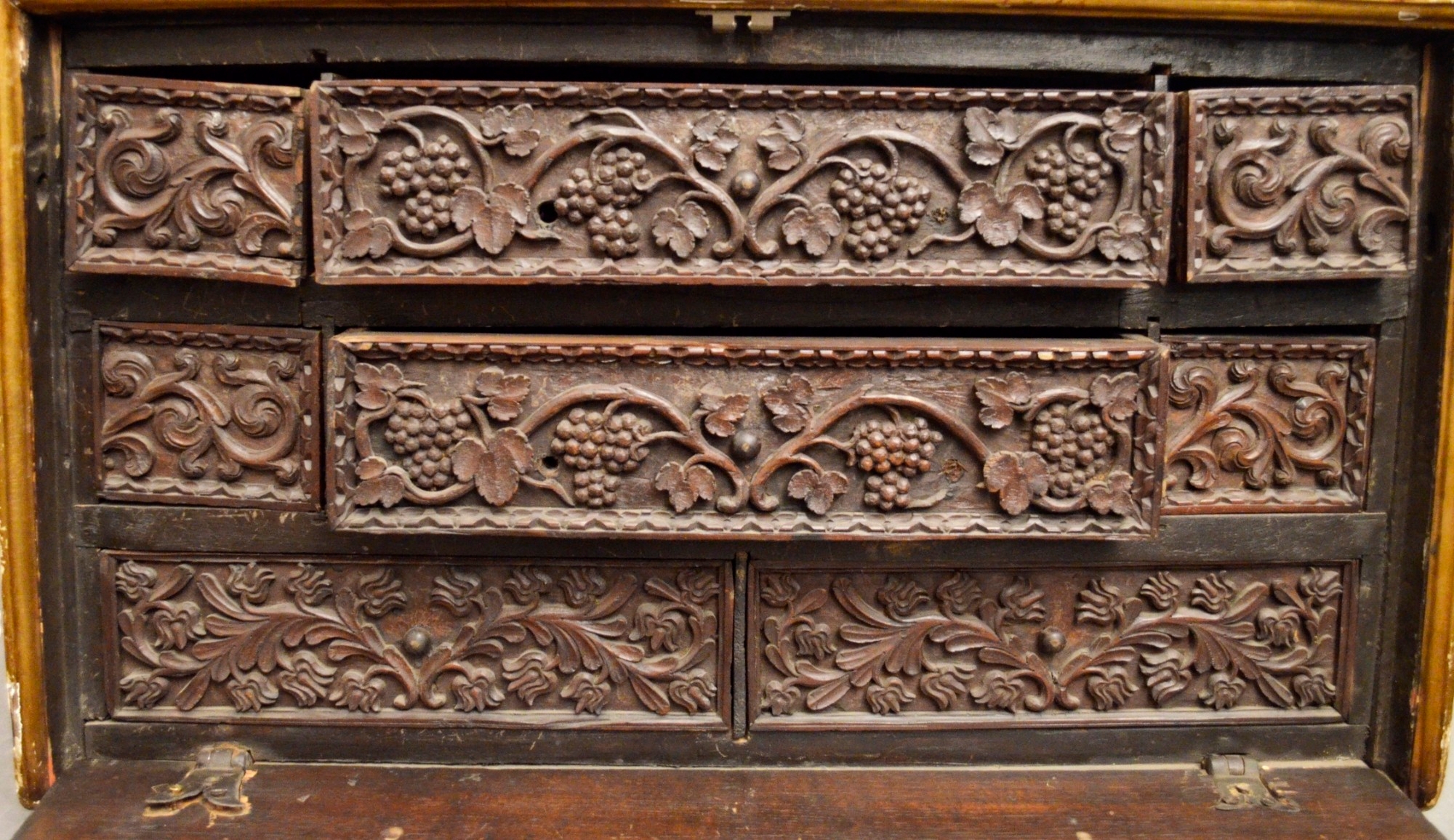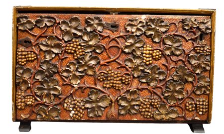MONETARIO DA VIAGGIO in legno riccamente intagliato sul fronte a motivi vegetali su fondo in lacca rossa Spagna fine 600 primi 700 h cm 48 x 78 x 38,5