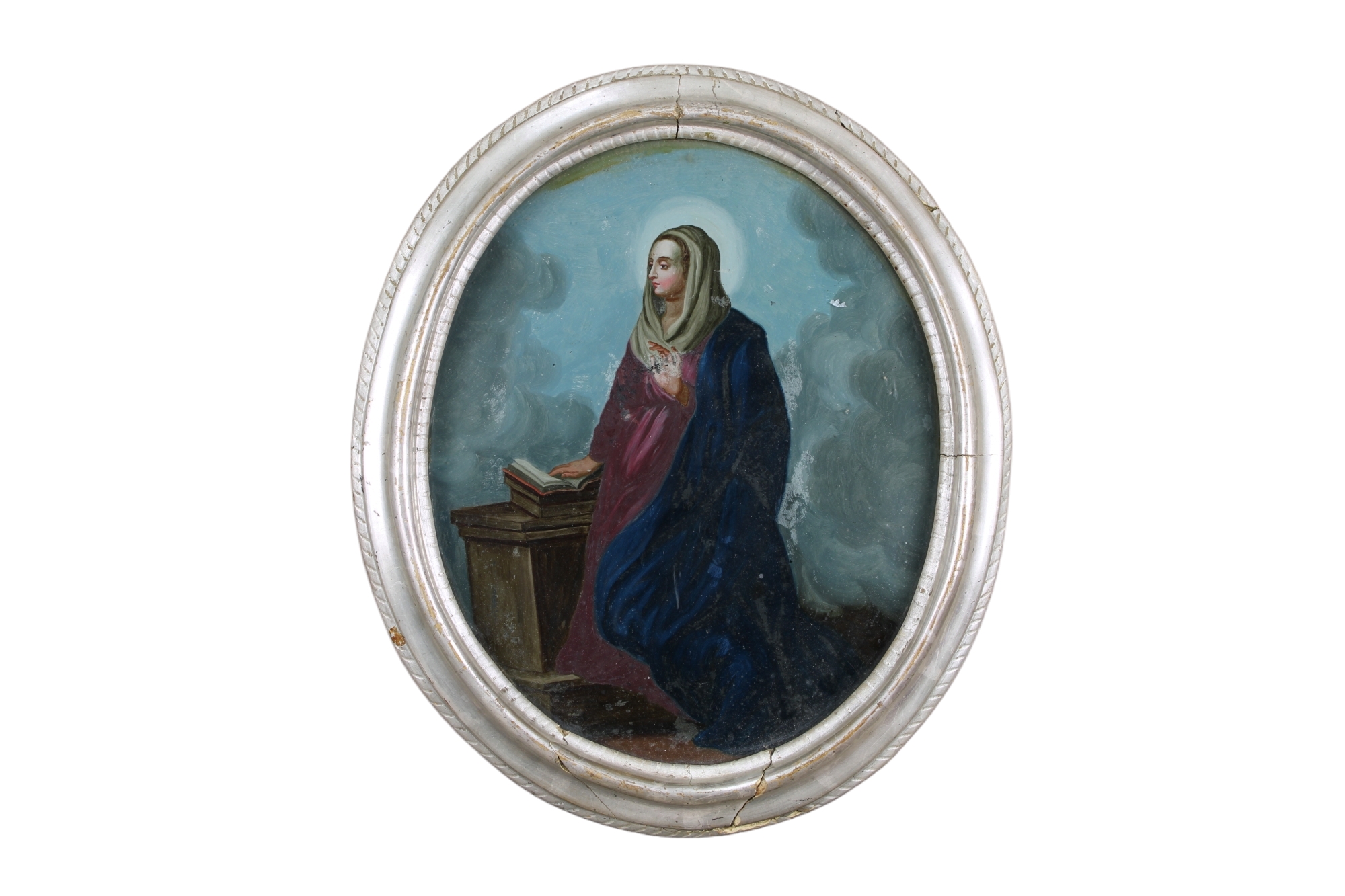 PITTURA SU VETRO DI FORMA OVALE raffigurante Madonna dentro cornice in legno scolpito e argentato Sicilia XVIII secolo h cm 35 x 30 / cornice h cm 42 x 36