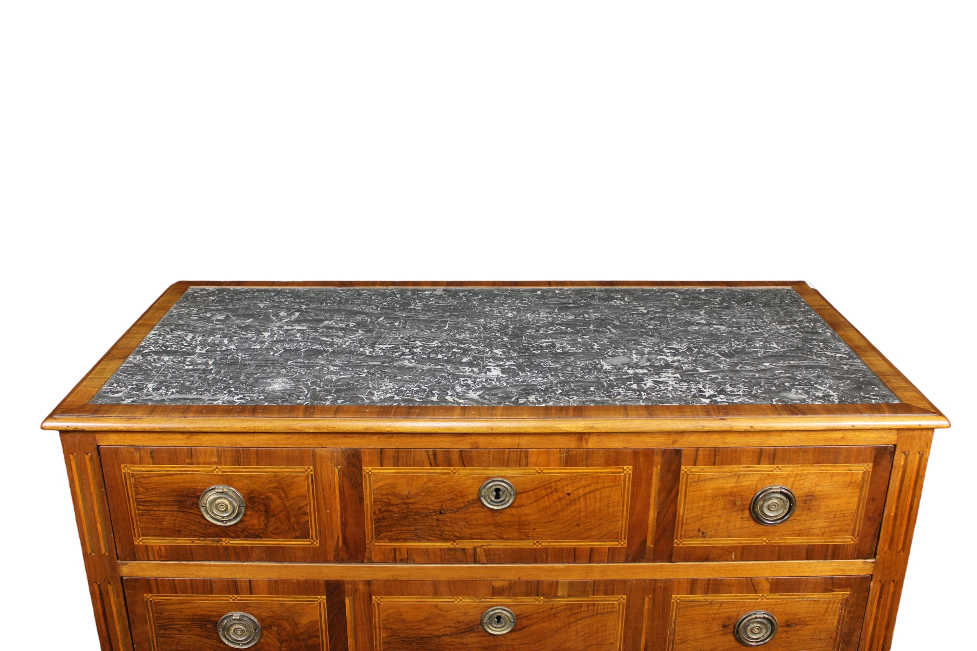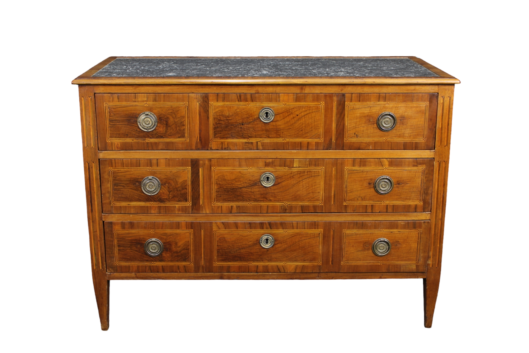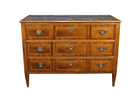 CASSETTONE LUIGI XVI A TRE CASSETTI lastronato in radica di noce con tarsie in varie essenze di legno piano in marmo grigio di Billiemi Sicilia Fine XVIII secolo h cm 94 x 129 x 61,5