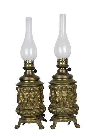 COPPIA DI LUMI in metallo sbalzato e finemente cesellato raffigurante allegoria di putti Sicilia Fine 800 h cm 58,5 x 16
