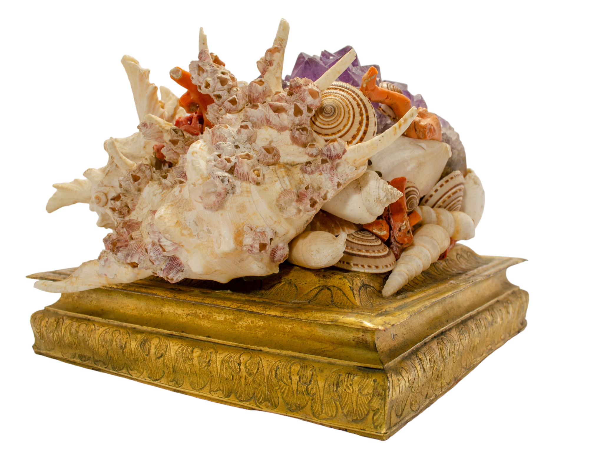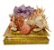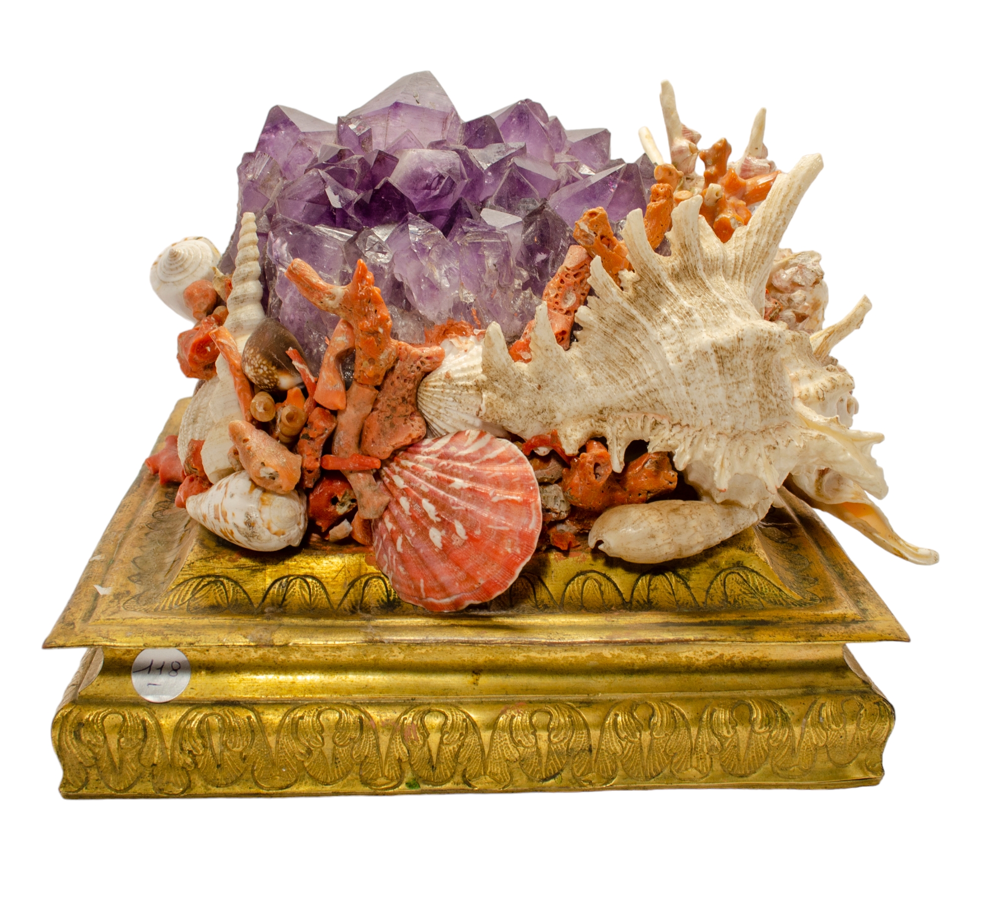 GRUPPO di minerali e conchiglie realizzata du base in bronzo dorato composto da blocco in ametista, rametti di corallo trapanese e conchiglie di vario genere Roma 800 h cm 18 x 12 x 21