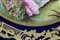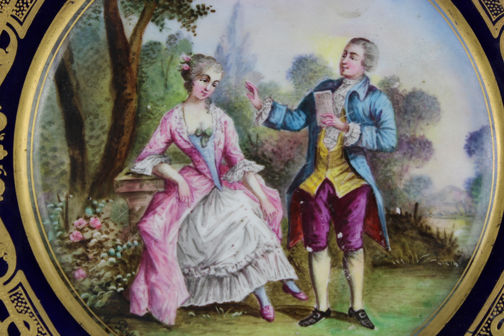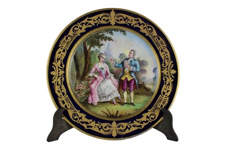 PIATTO in porcellana dipinta raffigurante scena galante dentro riserva e lumeggiature in oro manifattura ligone fine 800 cm Ø 28