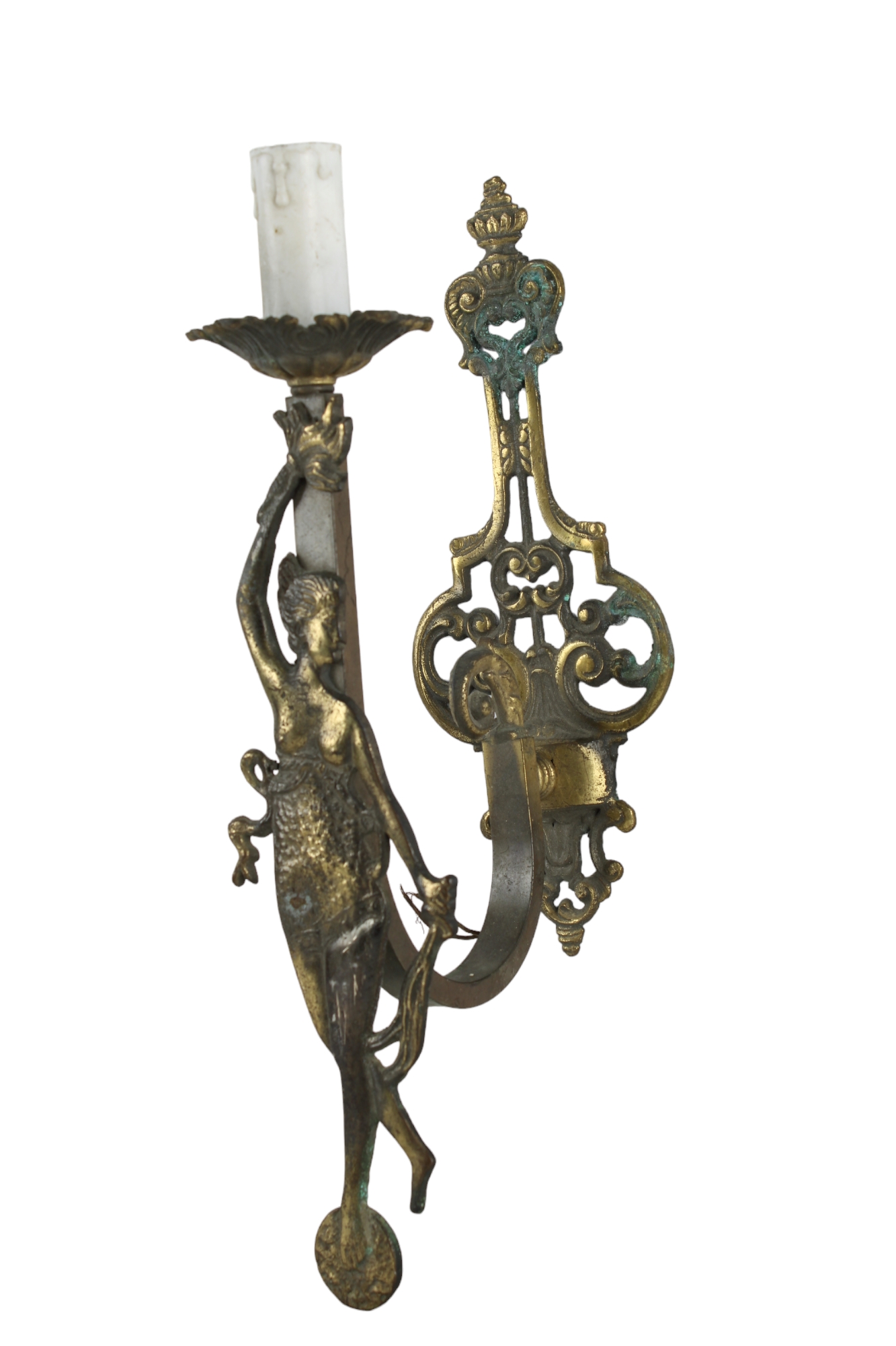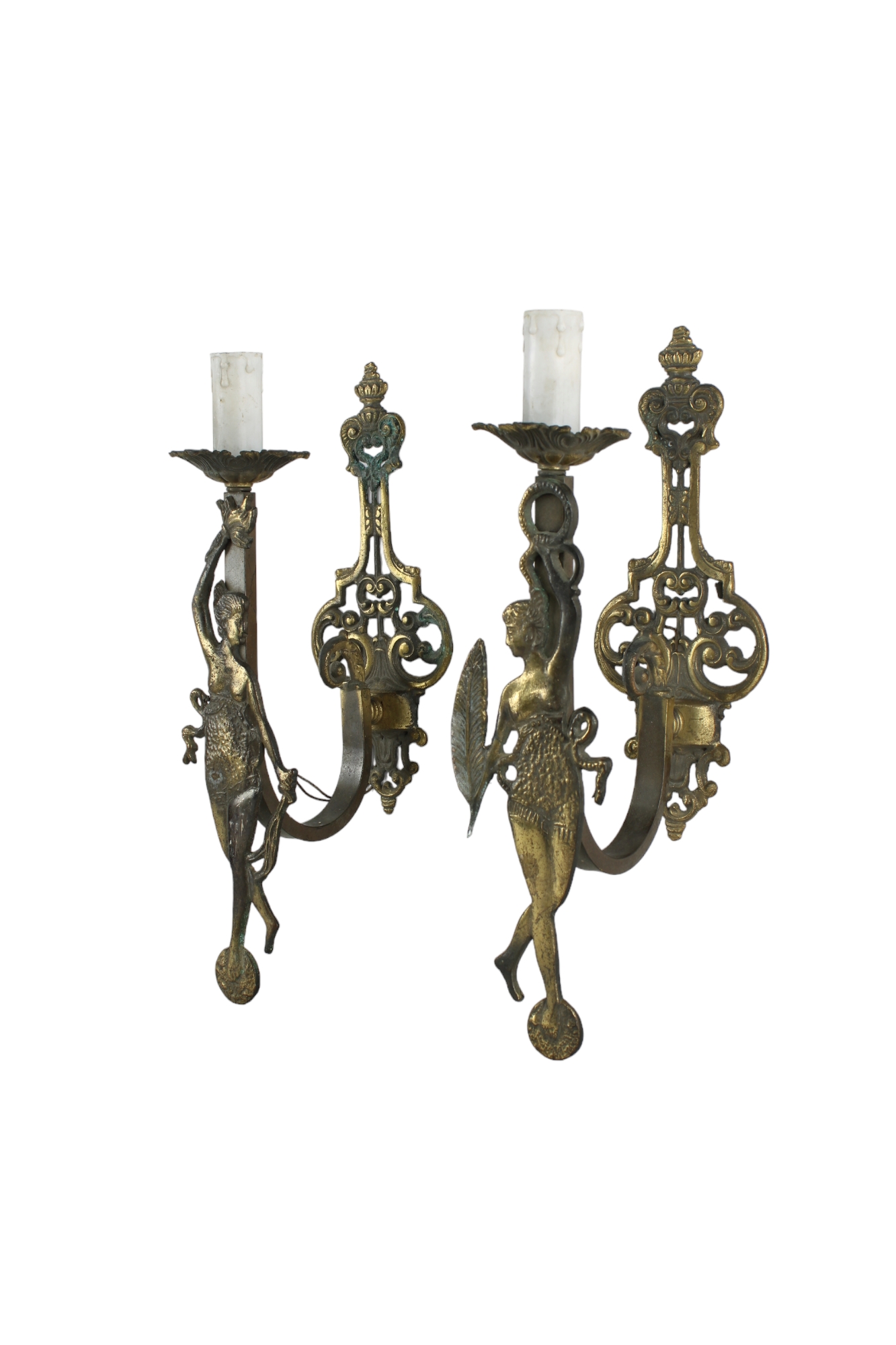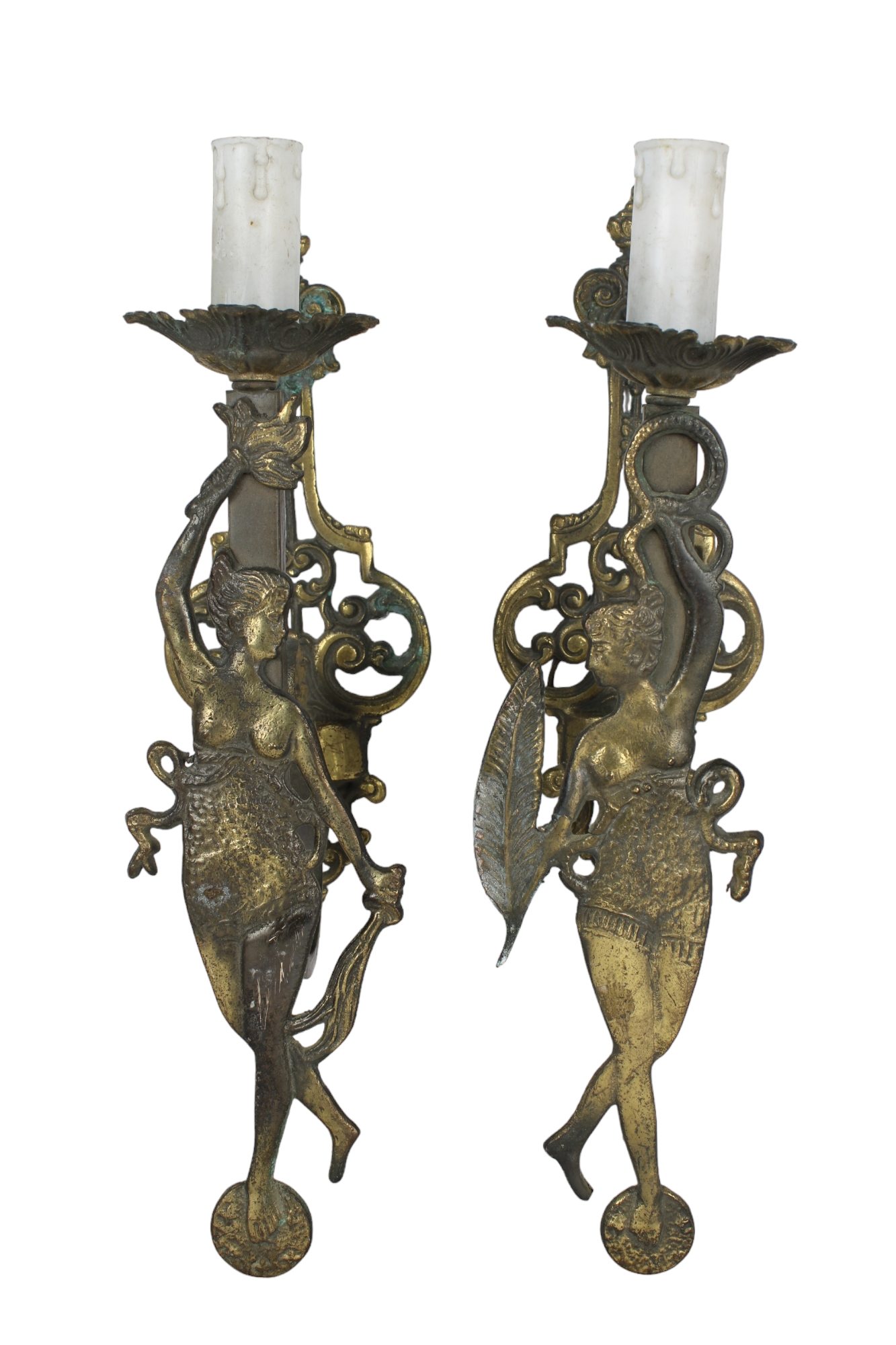COPPIA DI APPLIQUES in fusione di bronzo ad una luce raffigurante figure femminili Sicilia periodo Liberty primi 800 fine 900 h cm 33 x 9,5 x 12,5