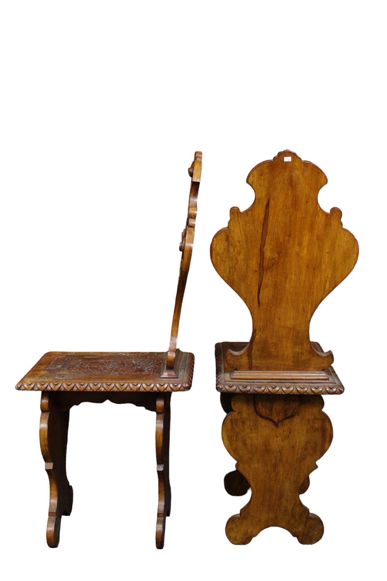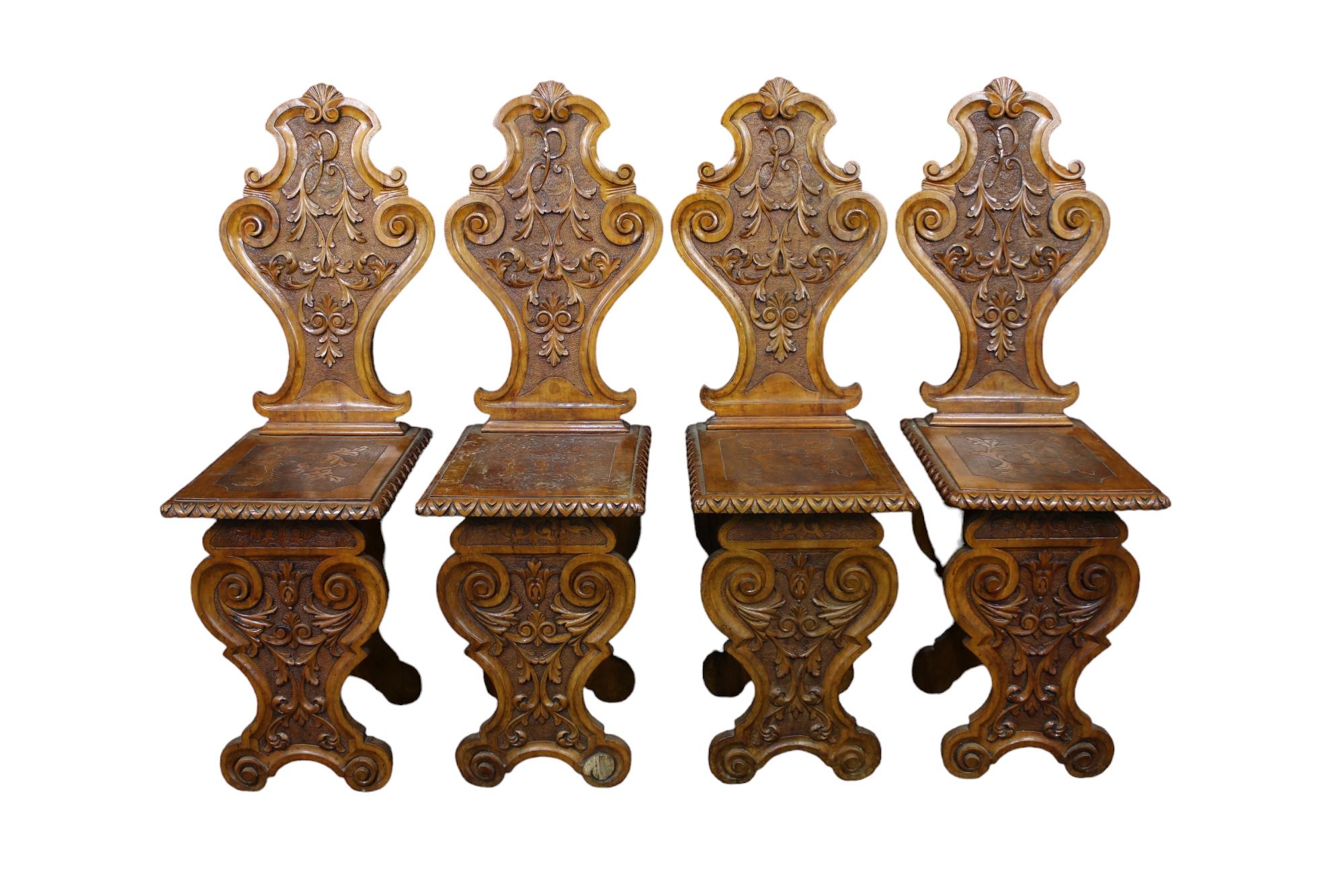 4 SEDIE in legno di noce riccamente scolpite di gusto rinascimentale maestranze Siciliane XIX Secolo h cm 107,5 x 36,5 x 45