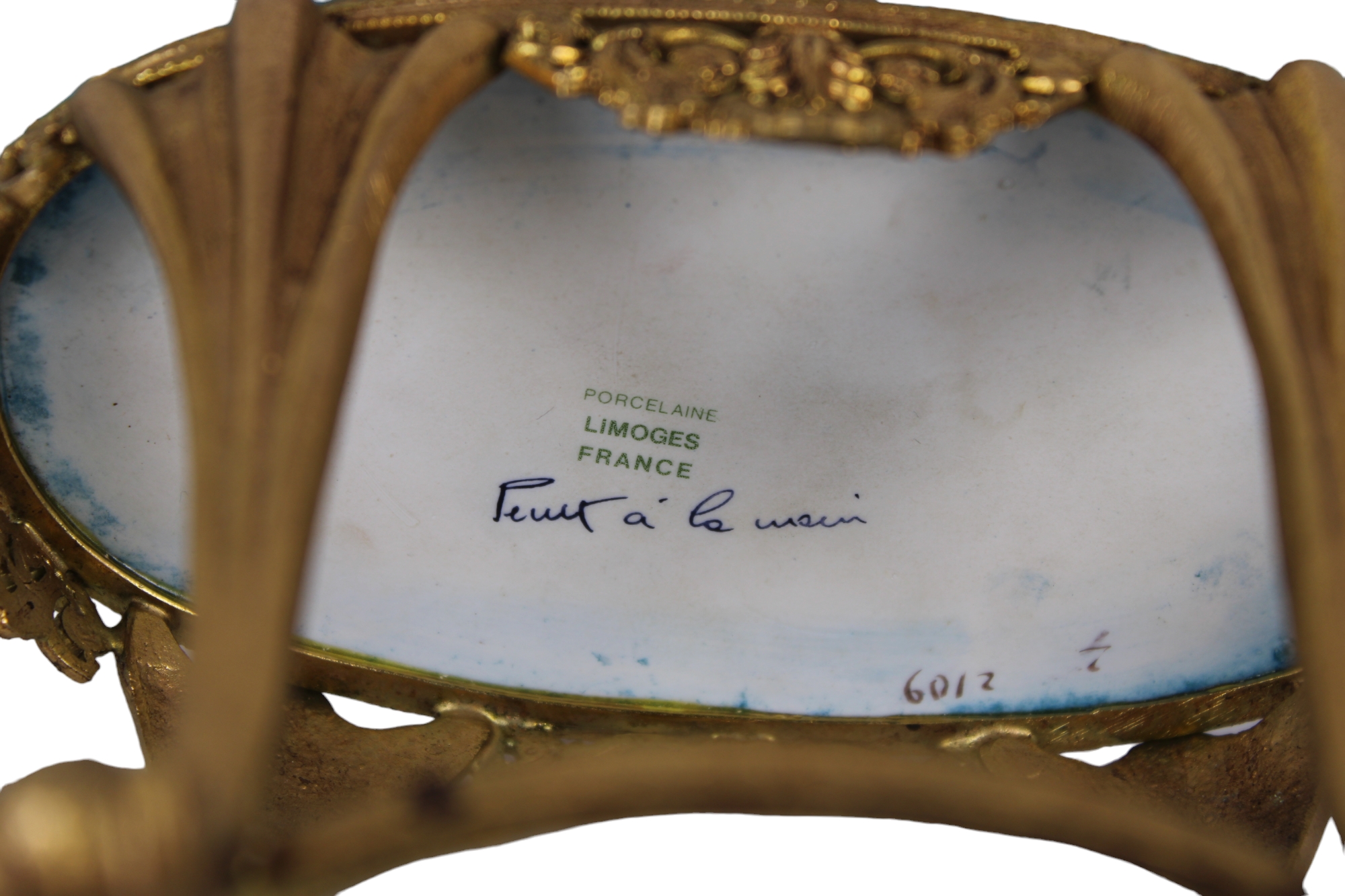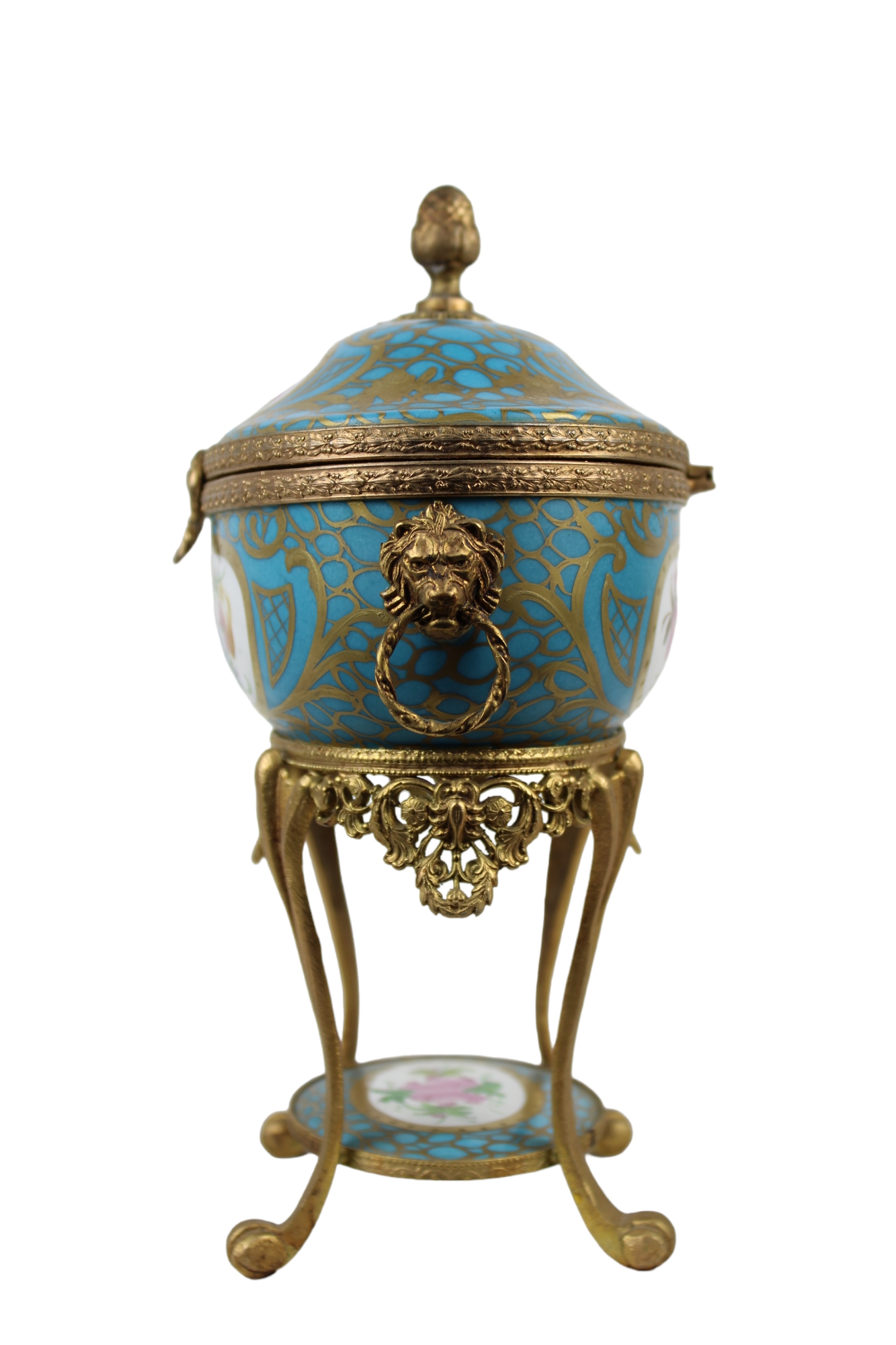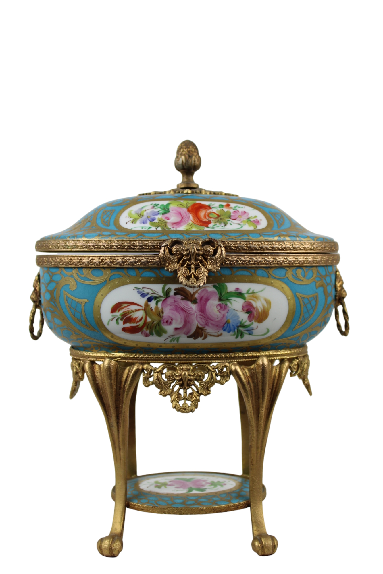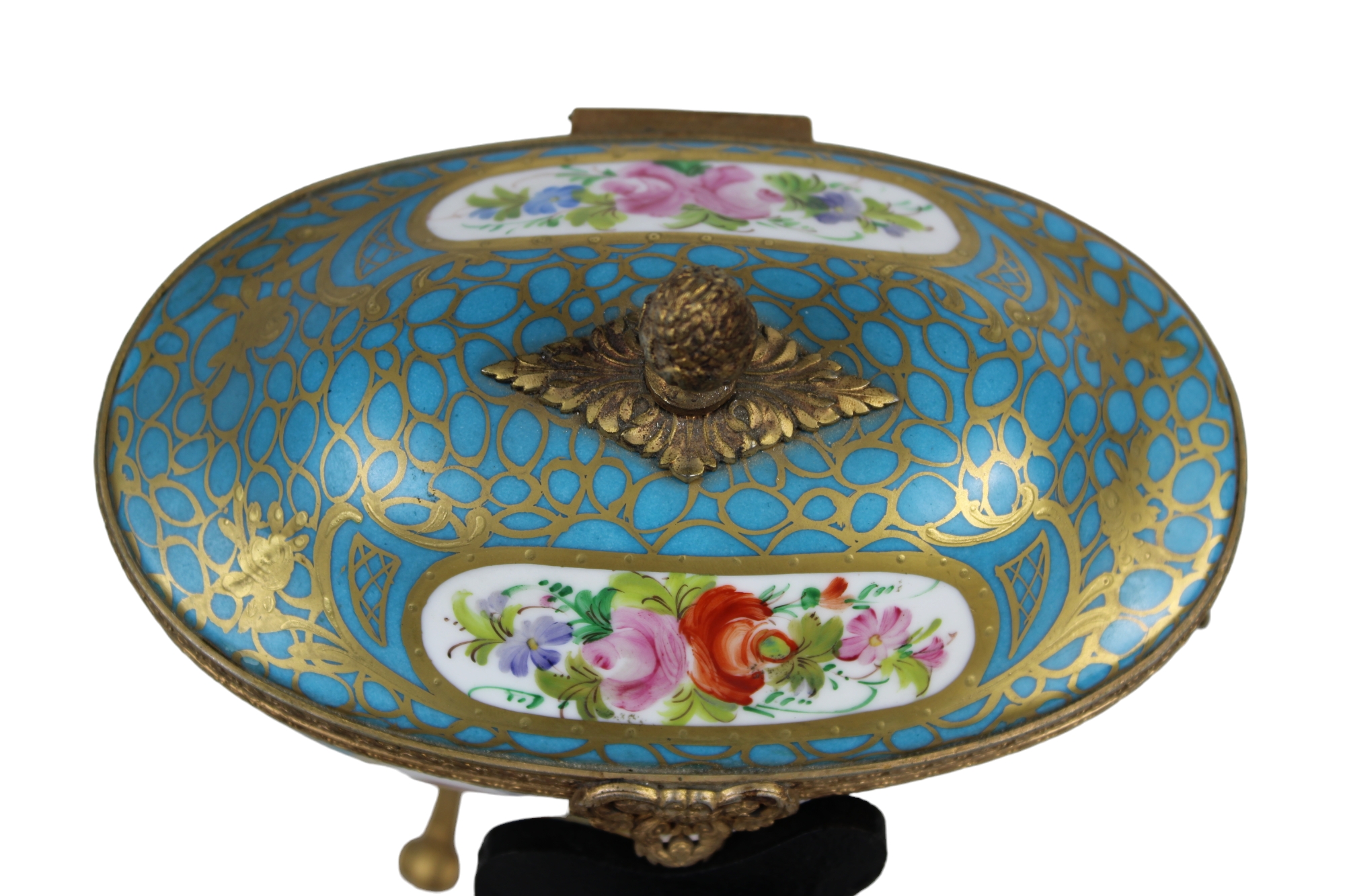 COFANETTO in porcellana dipinta dento riserve a motivi floreali su fondo turchese e lumeggiature in oro con montatura in bronzo finemente cesellato e dorato manifattura Limoges primi 900 h cm 23,5 x 18 x 11,5
