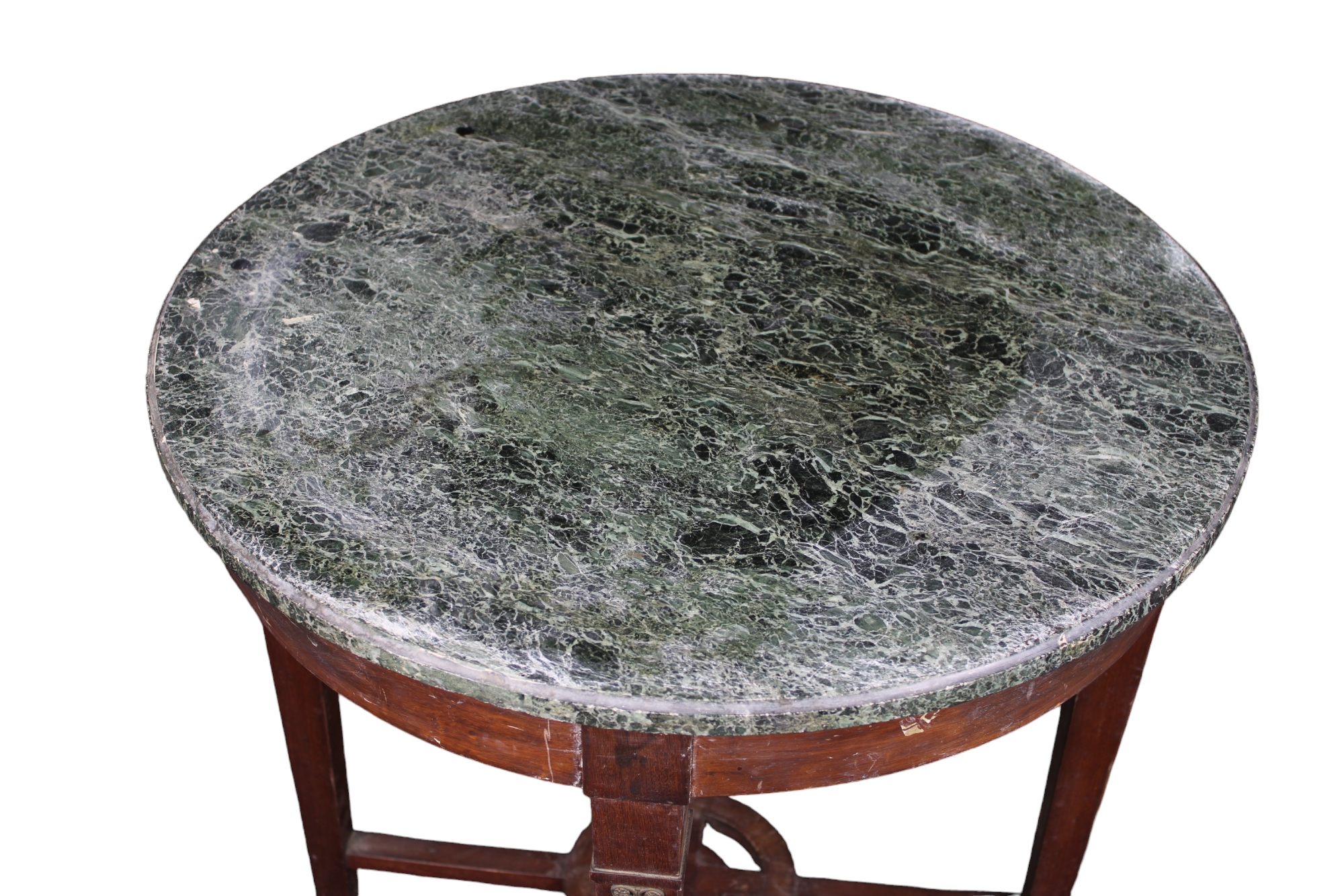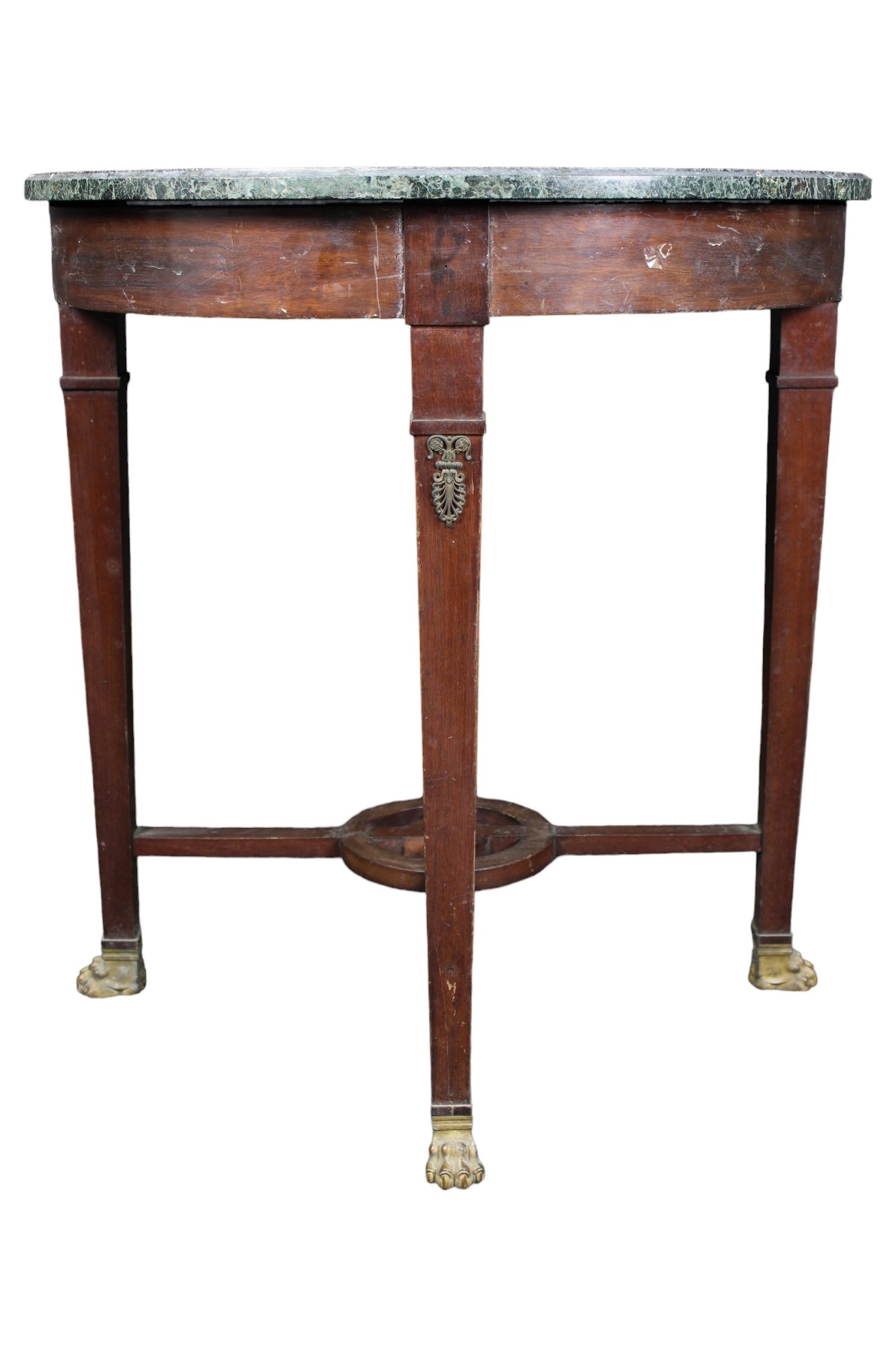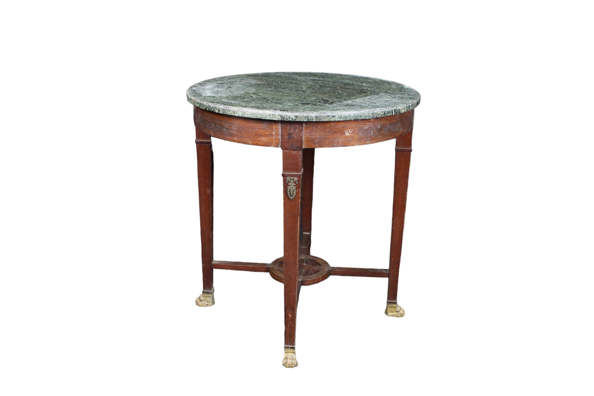 TAVOLINO IMPERO in mogano con piano in marmo verde delle Alpi applicazioni e piedi in bronzo dorato Francia XIX Secolo h cm 74 x Ø 69
